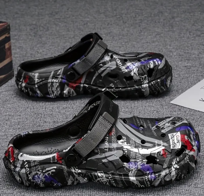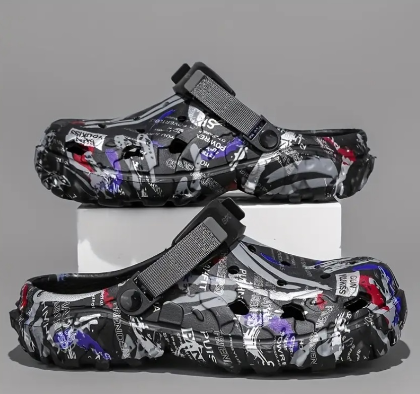 EVA素材なので履きごごち良好! グラフィックプリントのデザインが特徴的なクロッグサンダル、調整可能なストラップ付きで快適なフィット感を提供。