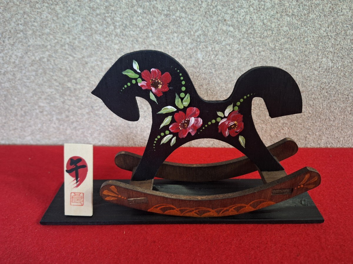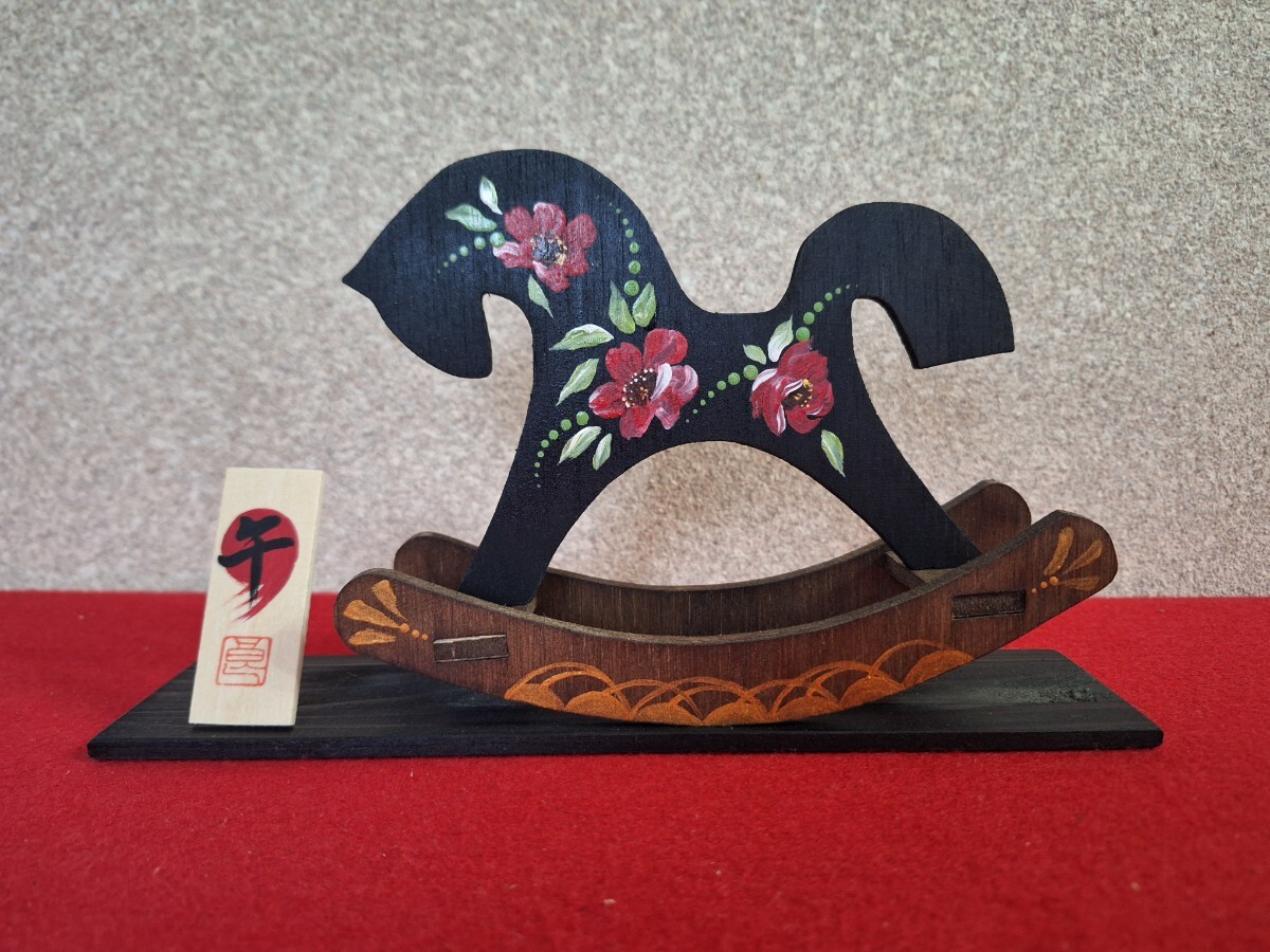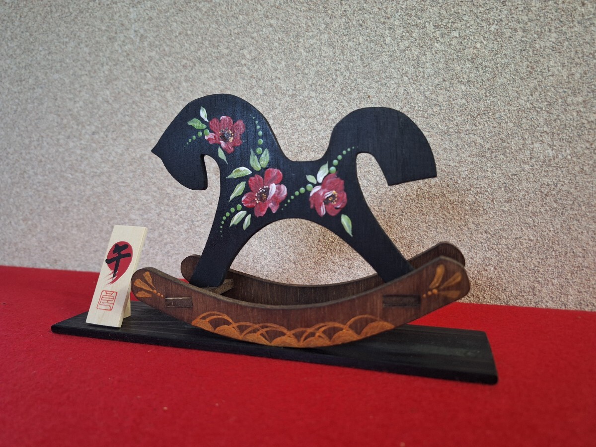 ゆらゆら黒馬の木馬の置物は現代的なお住いに飾ってもコンパクトで違和感の無いモダンさが特徴です。