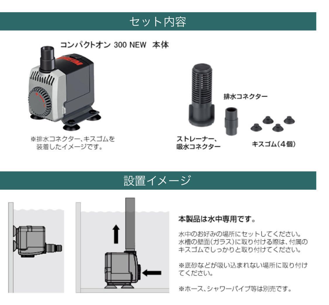 になります。)をセットしてありますが飼育生体の種類、サイズ、数に適しているかは分かりませんのでご了承くださいませ。また、発送時はポンプは箱から出してセットして発送をさせて頂きますのでご了承ください。