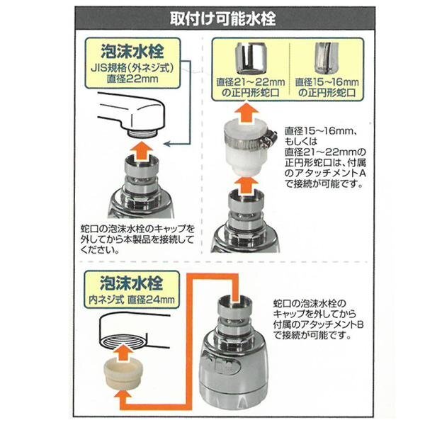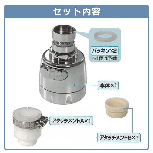 | ※ご購入前にお使いになる蛇口のサイズをご確認ください。 ※蛇口の形状によっては接続できない可能性もありますのでご了承ください。 ※ご使用になる蛇口によっては節水率が変化する場合があります。 ・掲載画像はイメージであり、実際の製品とは多少異なる場合があります。 ・パッケージや個装形態は入荷時期によって変更となる場合があります。 ・製品の仕様は品質の向上・改善のため、予告なく変更となる場合があります。 |