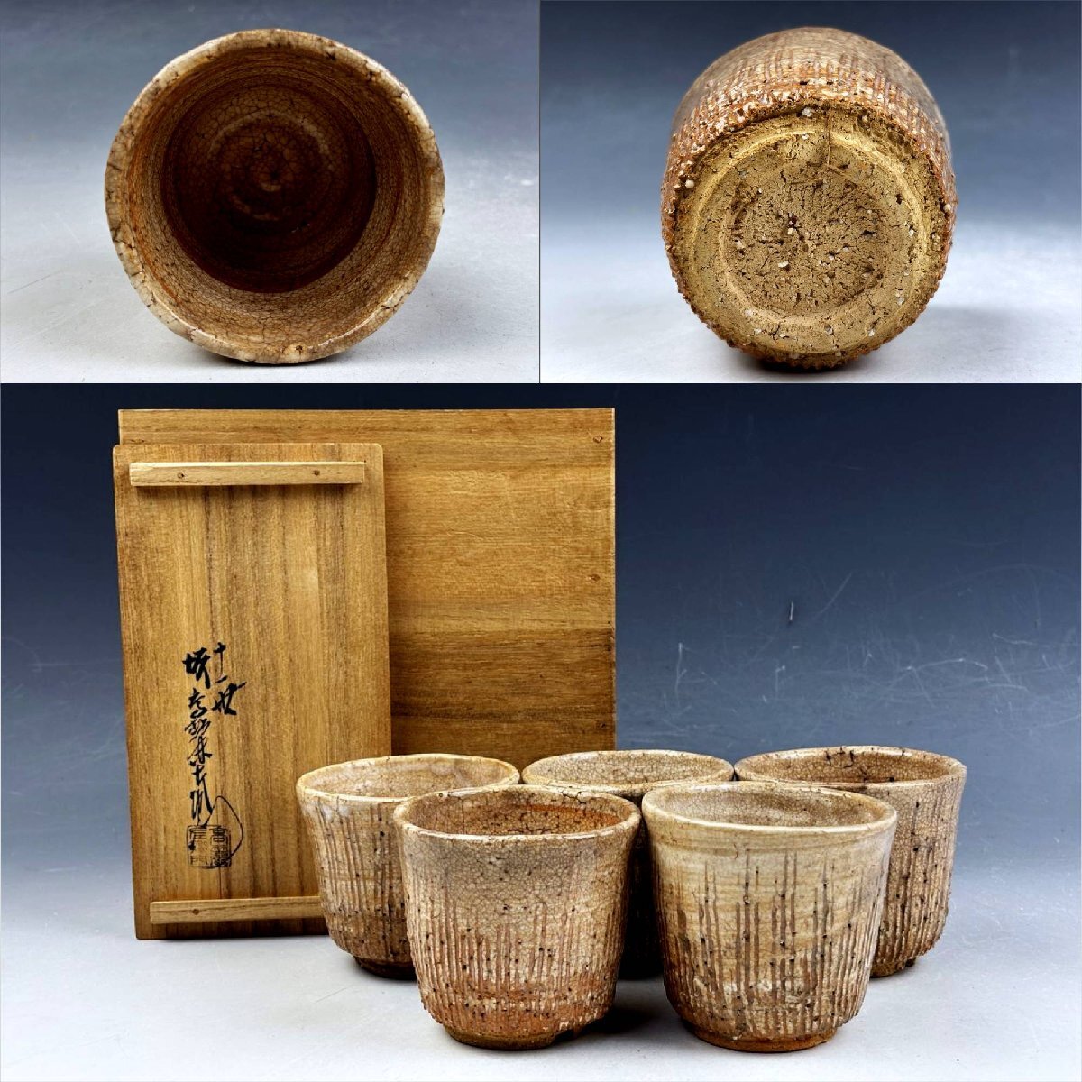 萩焼 十一世坂高麗左衛門(韓峯) 線掻縞文 汲出茶碗 湯呑 蕎麦猪口 向付 5客揃 無傷 共箱 懐石 和食器 茶道具 山口県無形文化財 時代物 古陶磁器 古美術骨董品 BSI110
