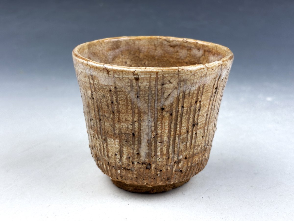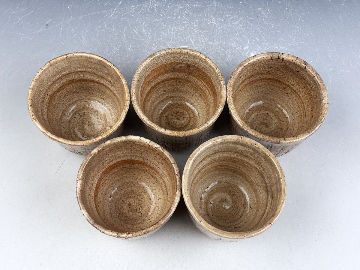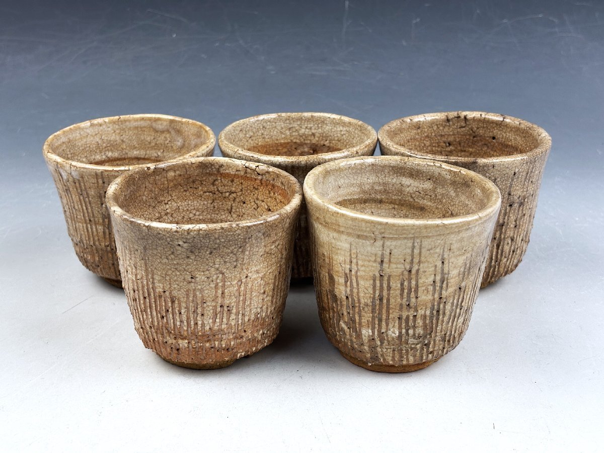 萩焼の名工 山口県指定無形文化財に認定 十一世坂高麗左衛門(韓峯)造の5客揃の湯呑茶碗です。優しい枇杷色の肌に線掻縞文が施された味わい深い汲み出し茶碗です。