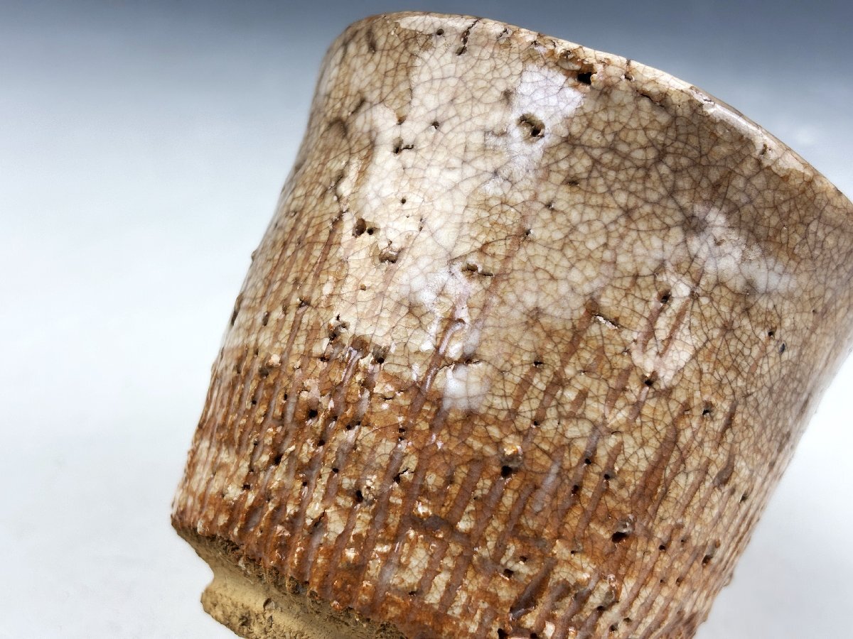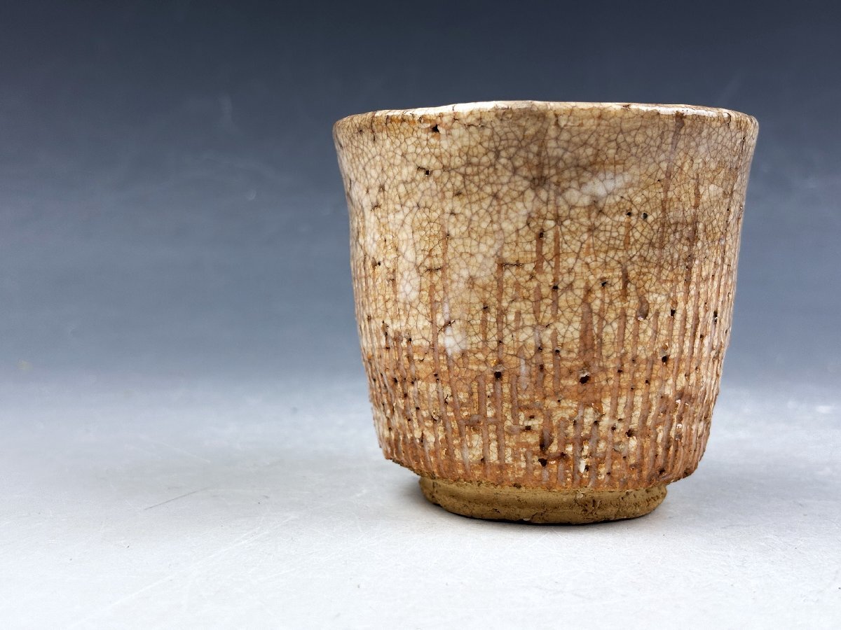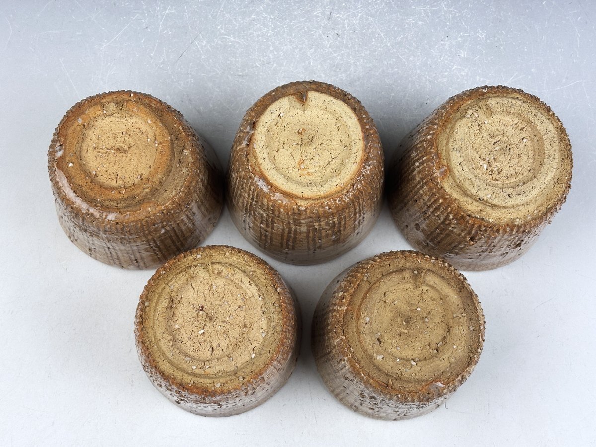 萩焼の名工 山口県指定無形文化財に認定 十一世坂高麗左衛門(韓峯)造の5客揃の湯呑茶碗です。優しい枇杷色の肌に線掻縞文が施された味わい深い汲み出し茶碗です。