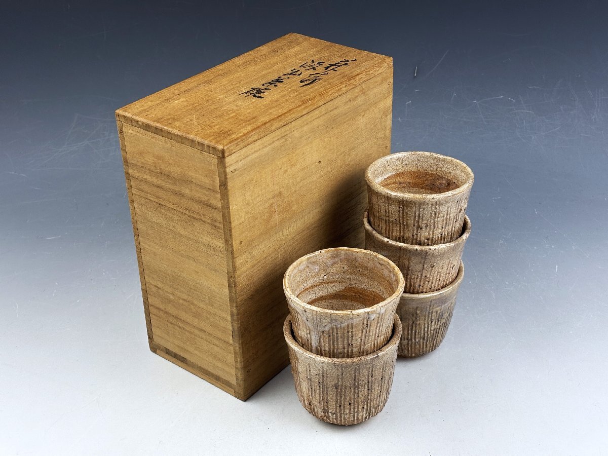 萩焼 十一世坂高麗左衛門 線掻縞文 汲出茶碗 湯呑 蕎麦猪口 5客揃 無傷 共箱 懐石 和食器 茶道具 古陶磁器 古美術骨董品 BSI110【遅日亭】