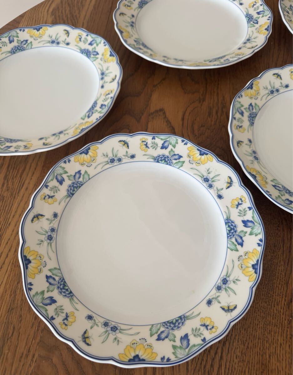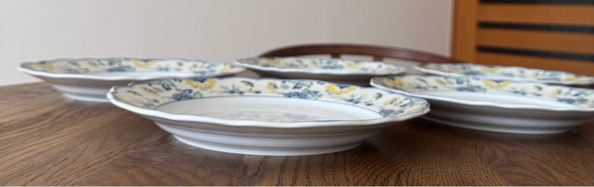 繊細な蝶と花々が描かれた、上品で華やかなデザインが特徴。テーブルに彩りを添えてくれる一枚です。