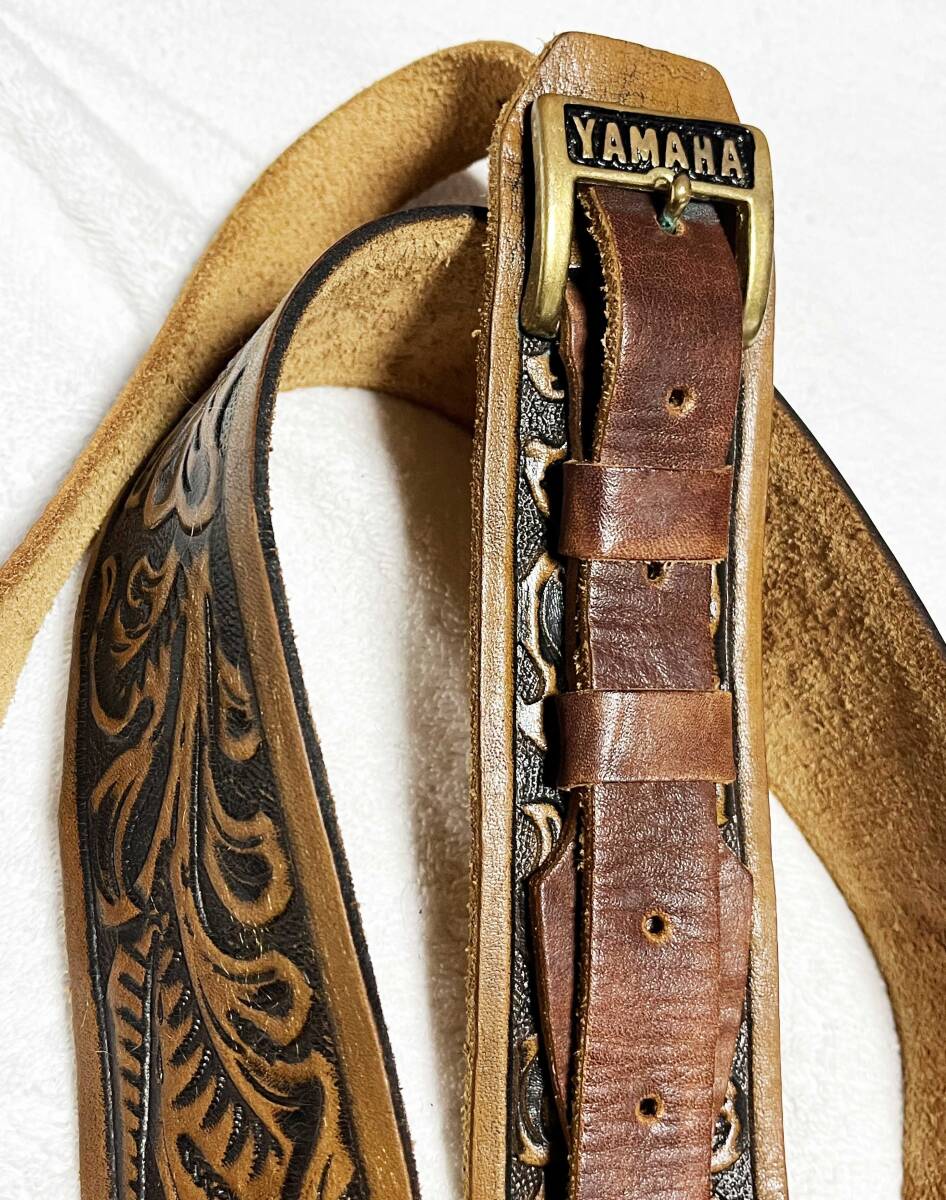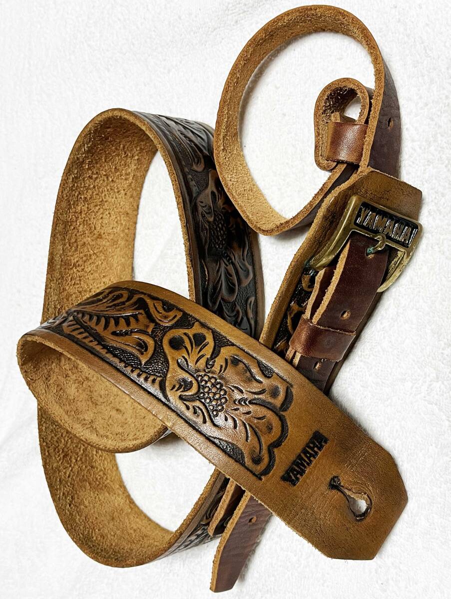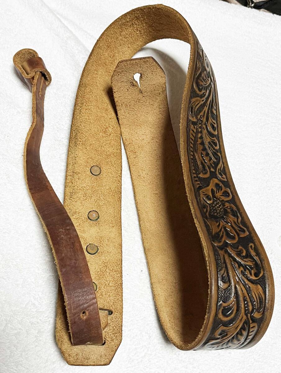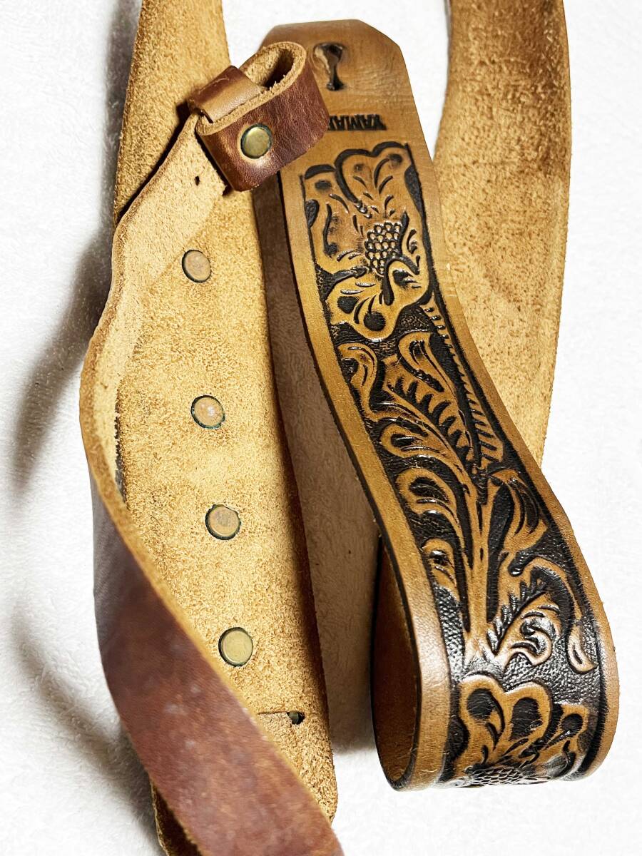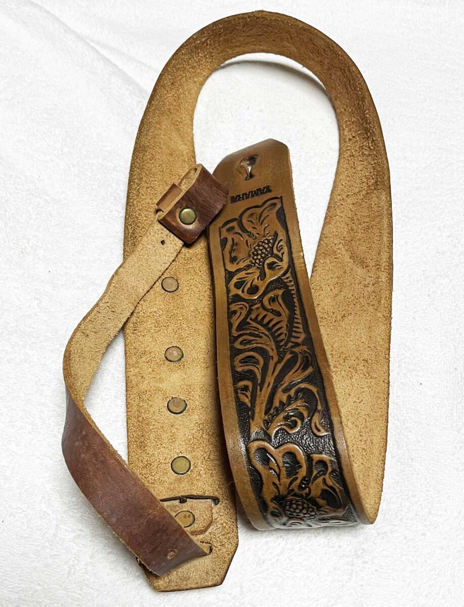 唐草模様があしらわれた希少な本革ストラップ。昔にはフォーク歌手も多数、使用していました。