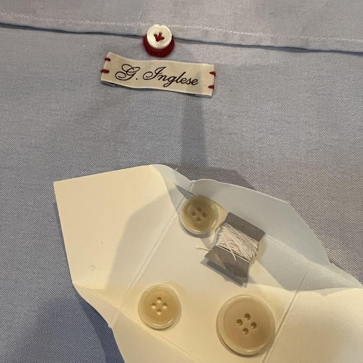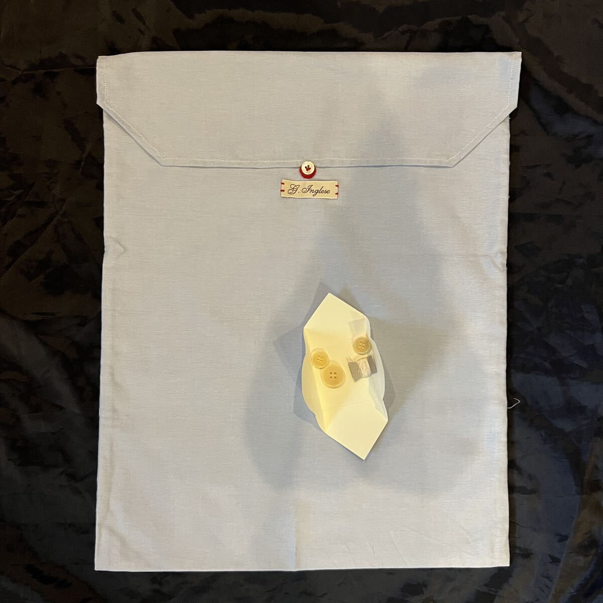 保管時についた皺はありますが、未使用なので紙タグがついたままで、付属品としてイングレーゼのロゴ付きの収納袋とボタンが付きます。