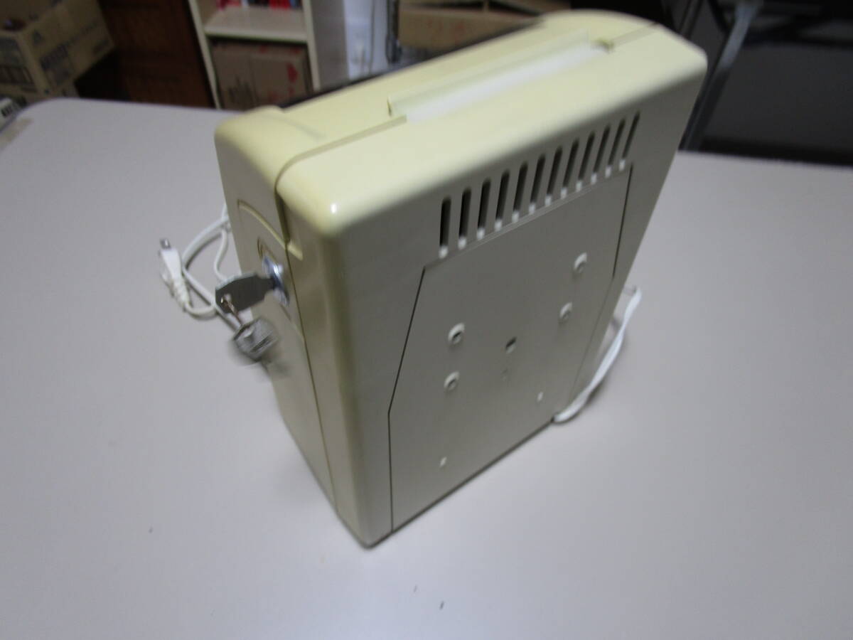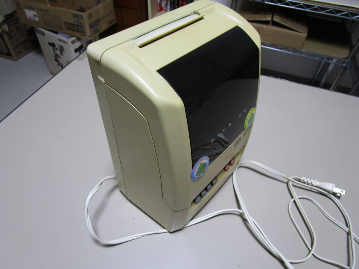さて、今回、出品致しますのは、マックスのタイムレコーダーです。型番は、ER-270S。コンセントを差し込み、通電をチェック!すると画像の通り、時刻が表示されました。外見に目立ったキズはありませんが、2007年に開催された、秋田国体のマスコットキャラクター・スギッチのシールが貼られています。
