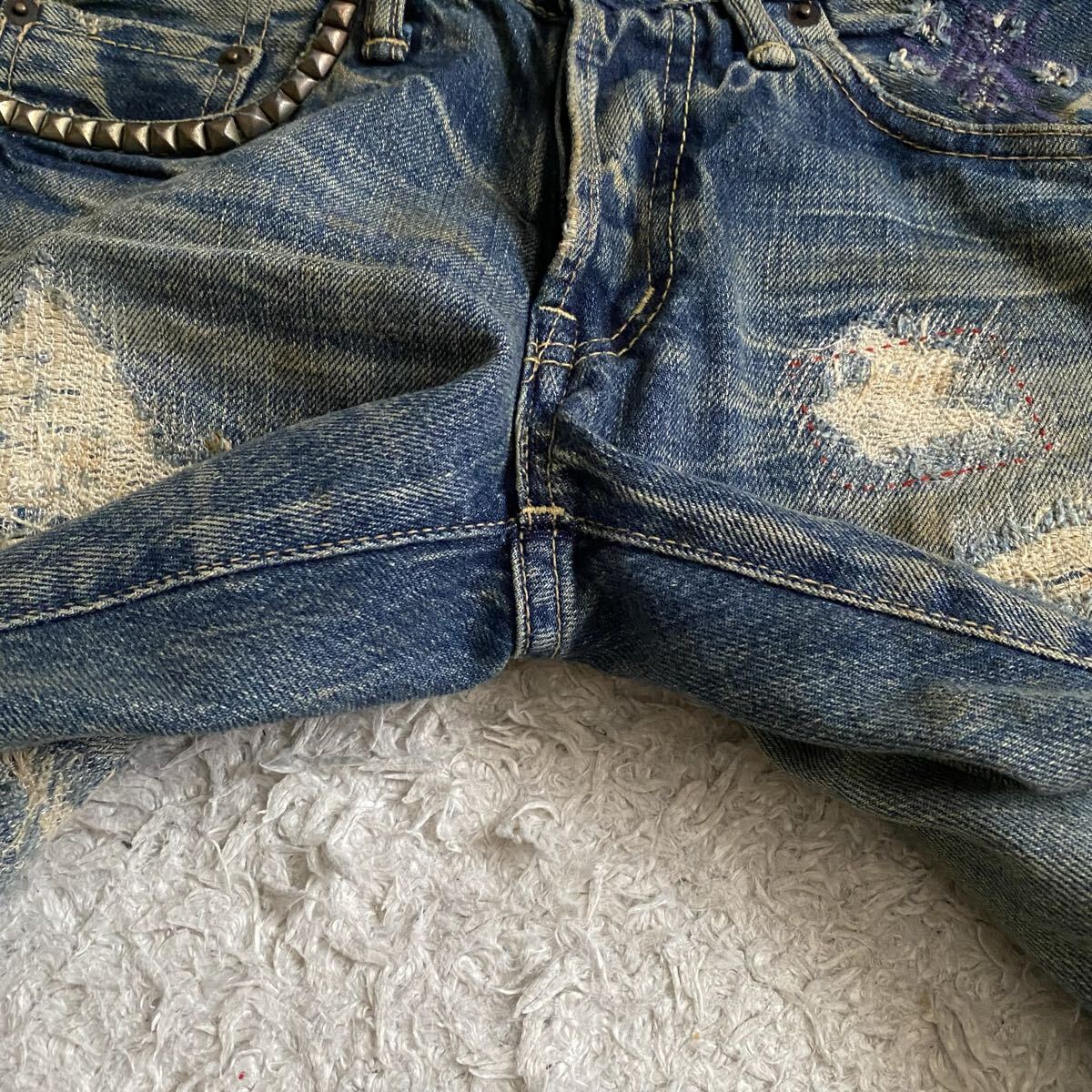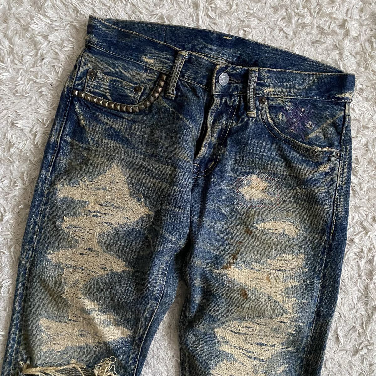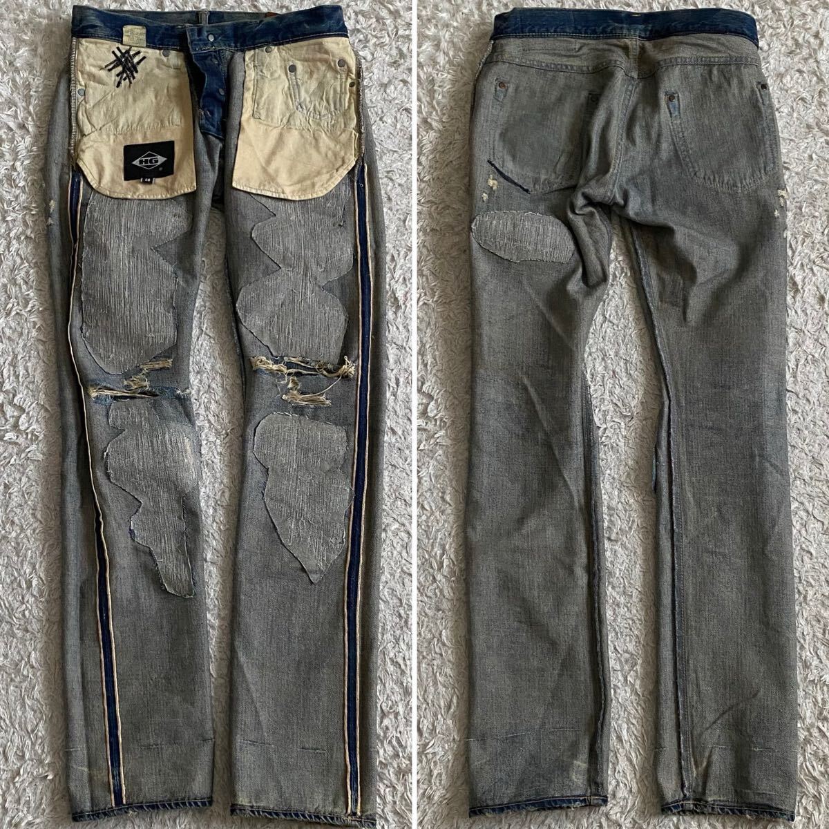 ハードなダメージ&リペア加工のデニムの 亀梨着用モデルです。