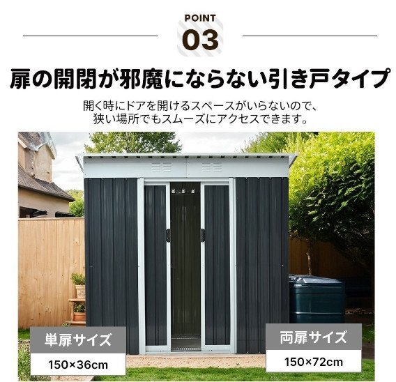 • ◎03扉の開閉が邪魔にならない引き戸タイプ 開く時にドアを開けるスペースがいらないので、狭い場所でもスムーズにアクセスできます。単扉サイズ:150*34cm両扉サイズ:150*68cm