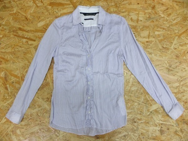 ZARA WOMAN ザラウーマン レディース 綿100% ヘアラインストライプ柄 前立フリル Vネック 長袖シャツ 小さいサイズ XS 紫