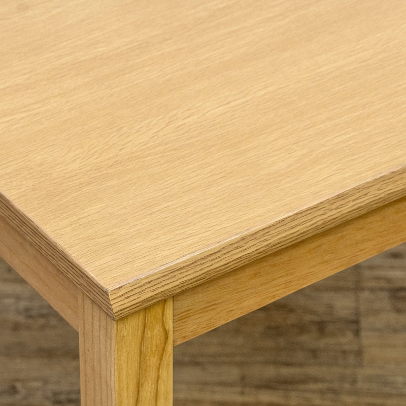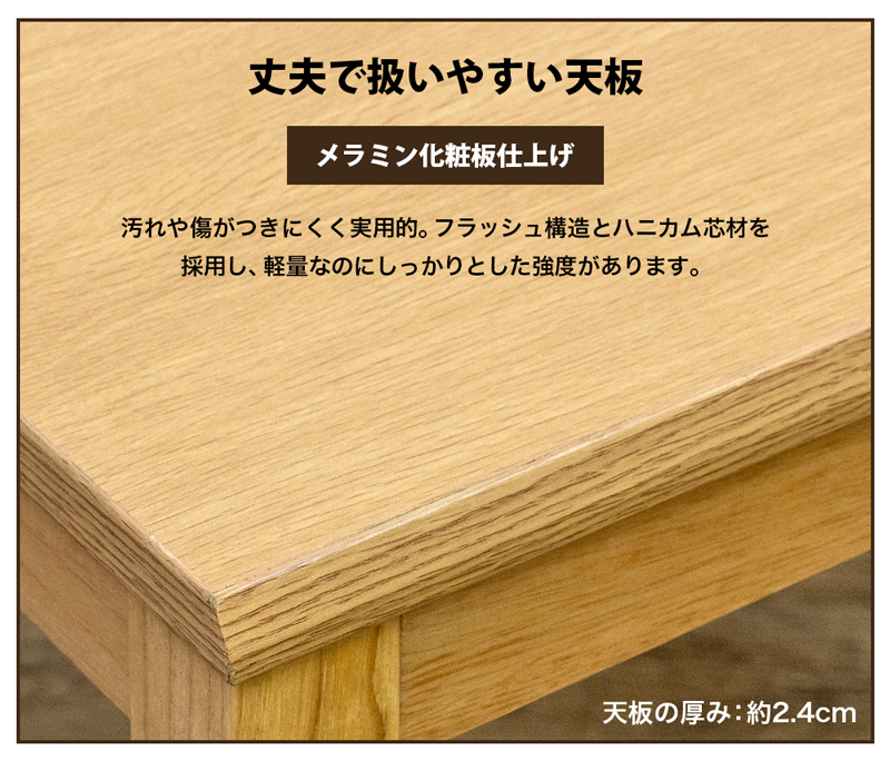 | 材質 | 天板:24mm厚合成樹脂化粧繊維板(メラミン化粧板)、フラッシュ構造、 芯材ハニカム 幕板:天然木(ラバーウッド、スプルース)、MDF(PU塗装) 脚:ラバーウッド(PU塗装) 600Wハロゲンヒーター(3mコード、手元コントローラー) |
