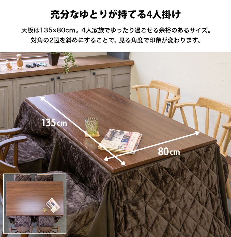 | 商品説明 | 組立品(15分) 年中使える4人掛けサイズ。 135×80cmのワイド長方形ダイニングコタツ、掛布団付きで届いてすぐ快適! 4人掛けにぴったりな135×80cmの長方形ダイニングコタツです。 掛布団セット付きで、届いてすぐにご利用いただけます。 ヒーターは600Wのハロゲン式。ファン付きで暖かさが全体に行き渡ります。 コントローラーは手元まで伸ばせるタイプで温度調整や電源操作が簡単です。 |