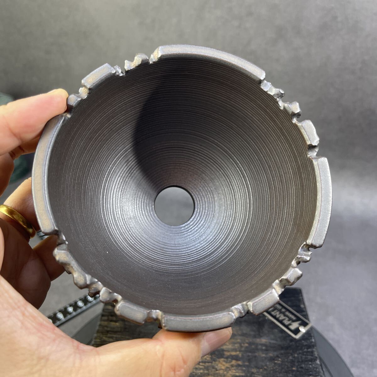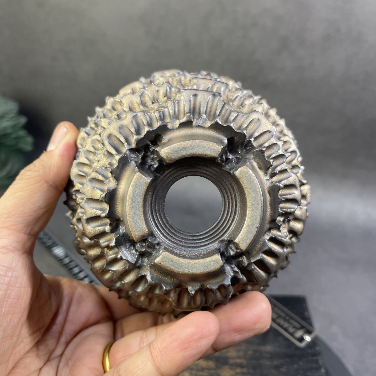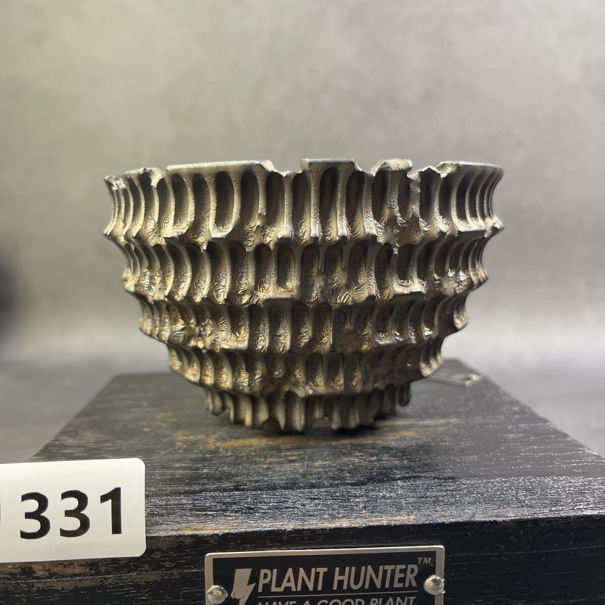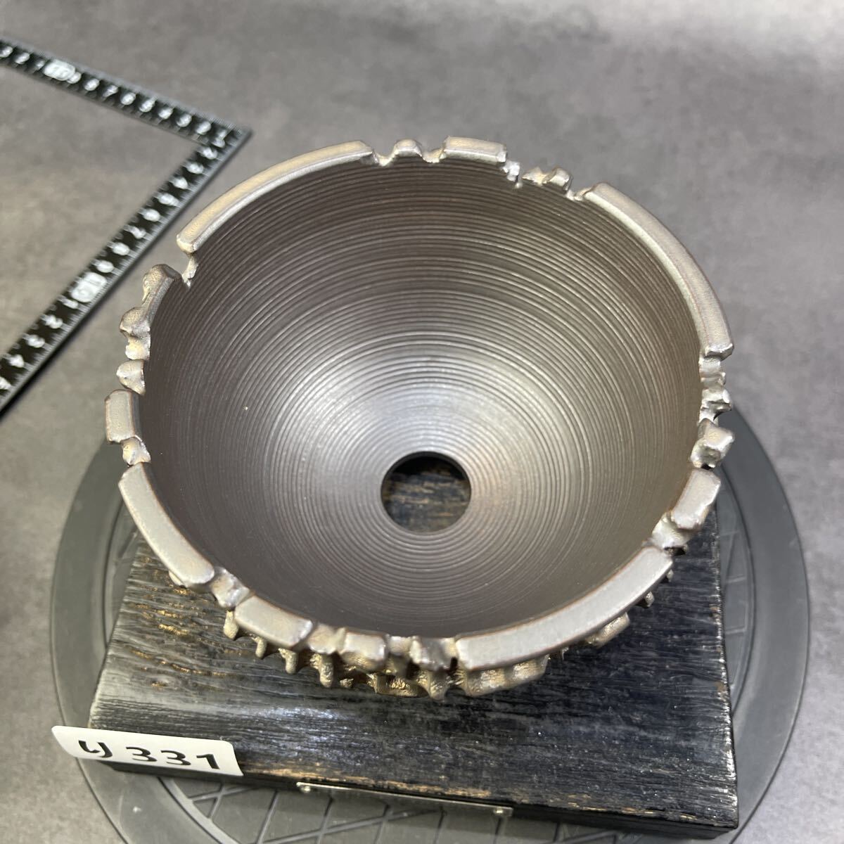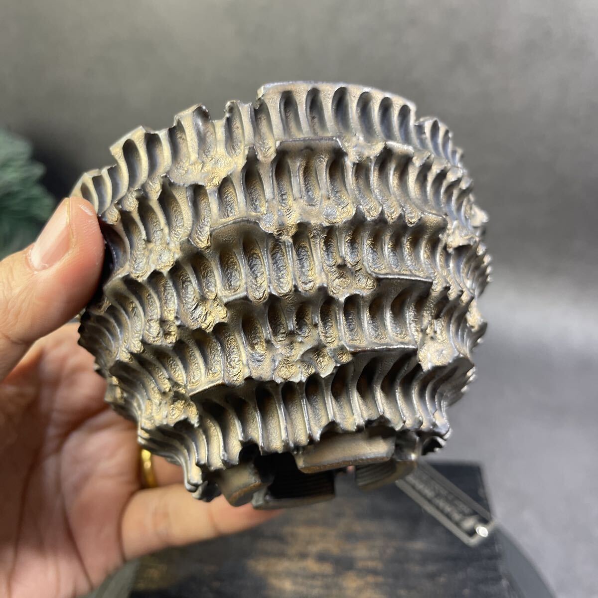 灰銀色のマットな釉調が立体的な造形を際立たせ、まるで鍛造された金属のよう。