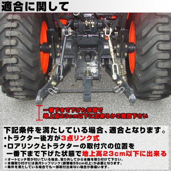 刈り込みながらチップ状に粉砕できるので、作業後の面倒な草回収が省けます! 様々な場面で活躍します! 人力では大変な面積や硬い草葉もハイパワーで刈り取ります! ■Y字刃が本体装着済み! 届いたその日からトラクターへ装着してすぐに作業が開始できます! 雑草刈りはもちろんの事、放牧地、休耕田や空き地等、様々な場所に活用頂けます。 丈の長い草もどんどん刈っていけます! ■多くの農家や酪農家、造園業に選ばれています! 3点リンク式で、幅広いトラクターに取り付け可能です。 機械が古いから装着できない…という心配もありません! ハイパワー&刈込み効率の良さが人気です! ■刈り幅145cmだから、広い土地でもスピーディー! 約145cmの幅を刈り込んでいけるので、作業効率がGOOD! 農地や牧場、グラウンド、公園等の広面積地でも作業スピードが速いです! ■長尺トップリンク(穴径20mm 調整幅 55-65cm)をご希望の方へサービス中! 他社では別売りですが、当店はご希望者様へ無料でサービス中! お持ちではない方も安心してご注文頂けます! ご希望の場合、ご注文時の備考欄よりご連絡下さい。 商品発送後のお申し出に関しては、対応出来ません。予め、ご了承下さい。