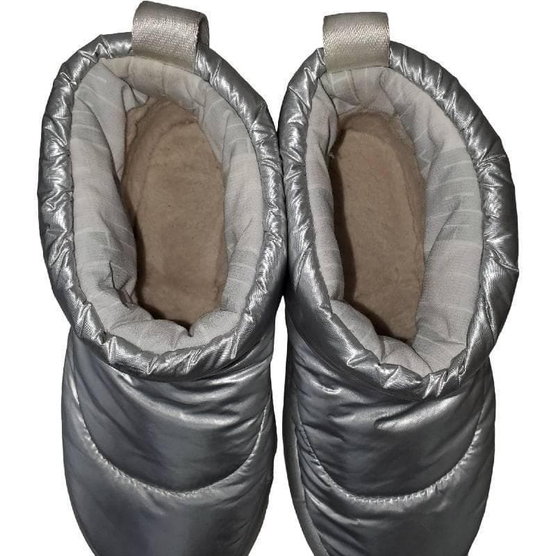 メタリックなシルバーカラーが目を引くデザインで、足元にアクセントを加えてくれる一足です。