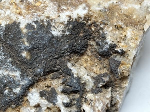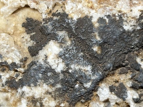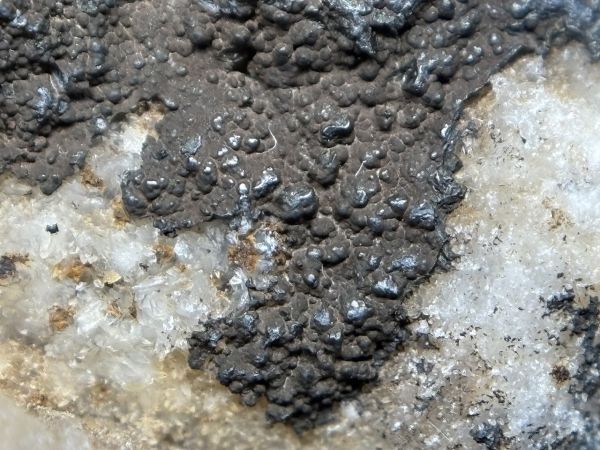 縄地鉱山産のクリプトメレンです。石英のい表面に黒色の被殻状集合体として産出します。