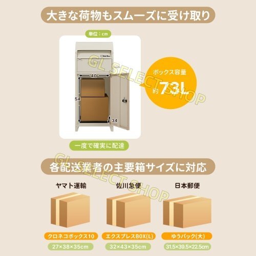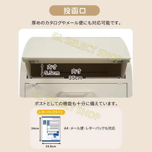• ◎03【ポスト一体型の大容量】不在時も樣々な荷物を受け取れる一体型!大容量で再配達の手間をなくします。上段に郵便ポスト。下段に宅配ボックス。【投函口】厚めのカタログやメール便にも対応可能です。ポストとしての機能も十分に備えています。A4メール便レターパックも対応。【取出口】取り出しは片手で簡単にでき、非常に便利です!【大きな荷物もスム一ズに受け取り】一度で確実に配達。ボックス容量約73L。
