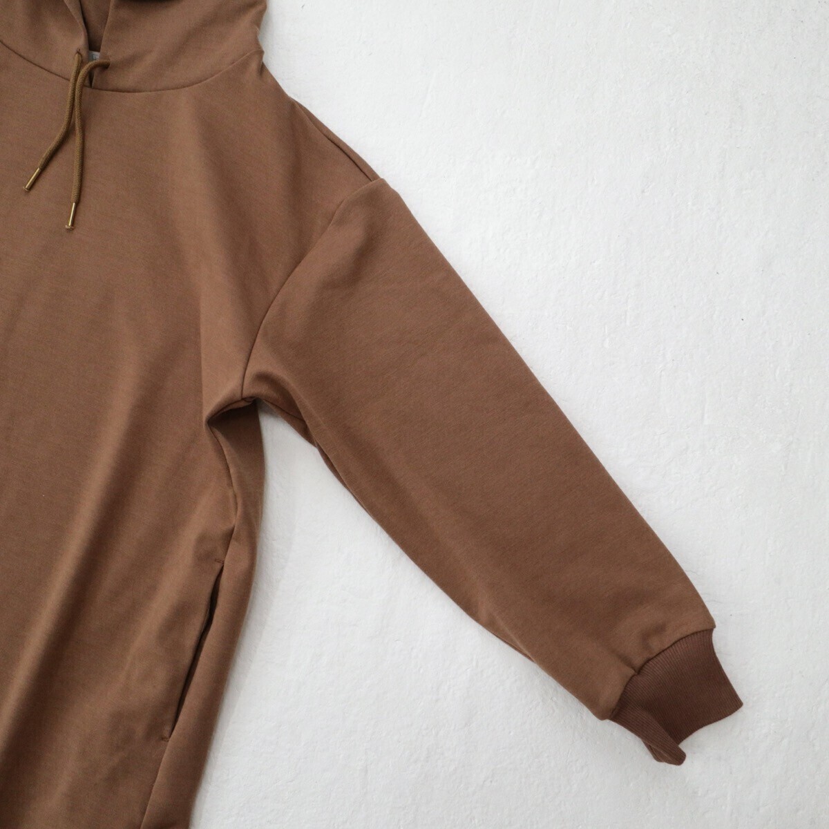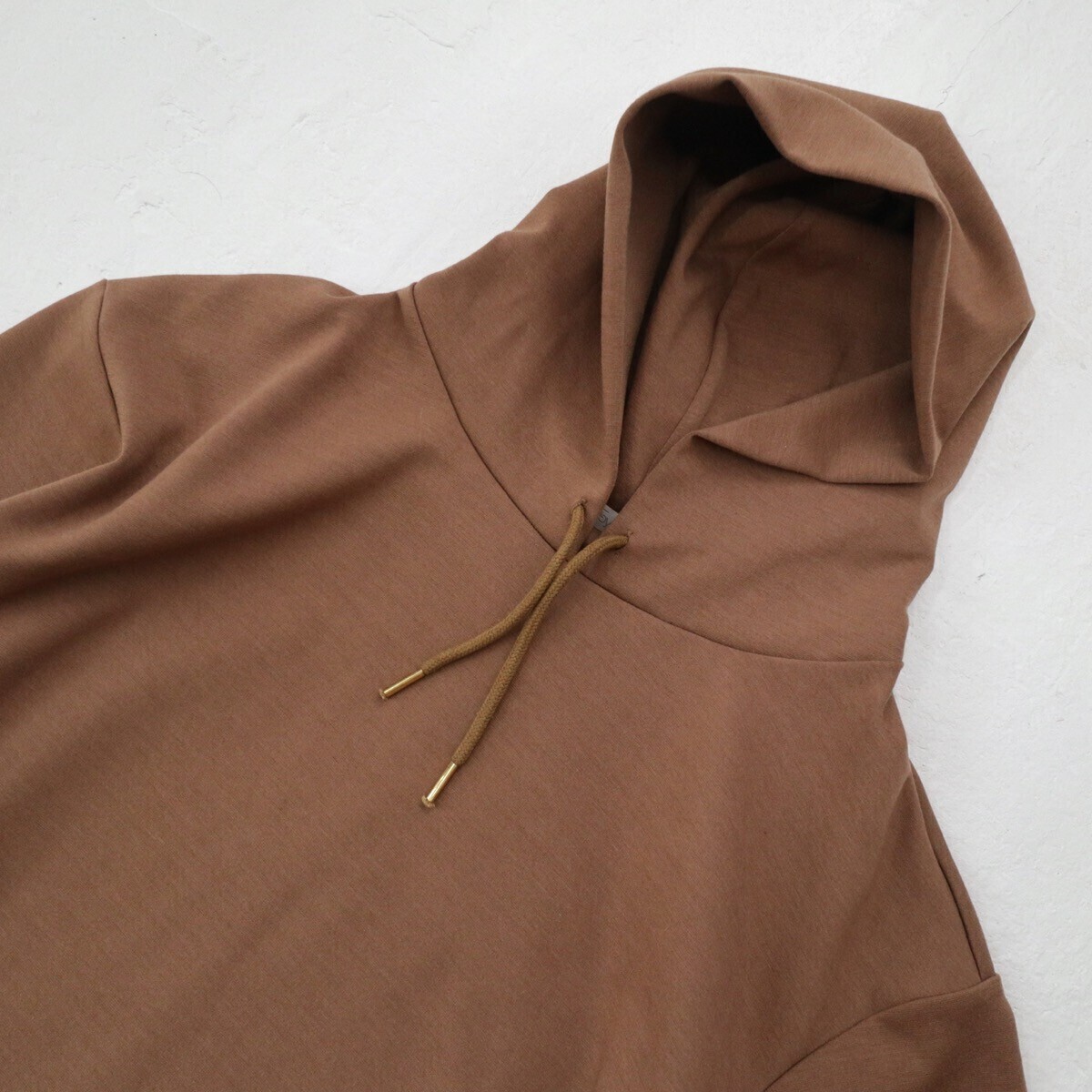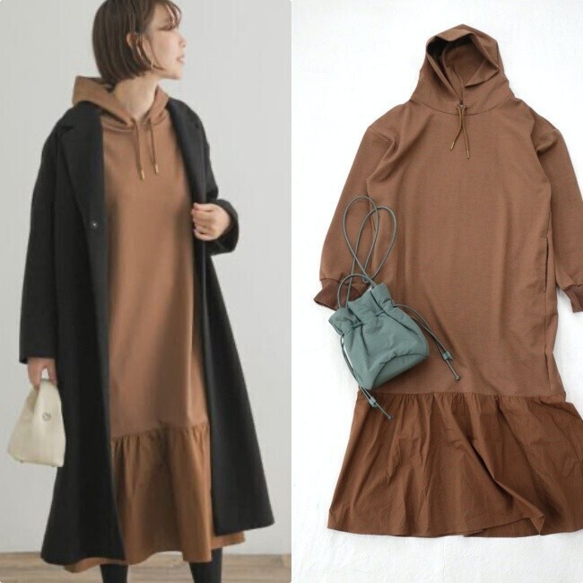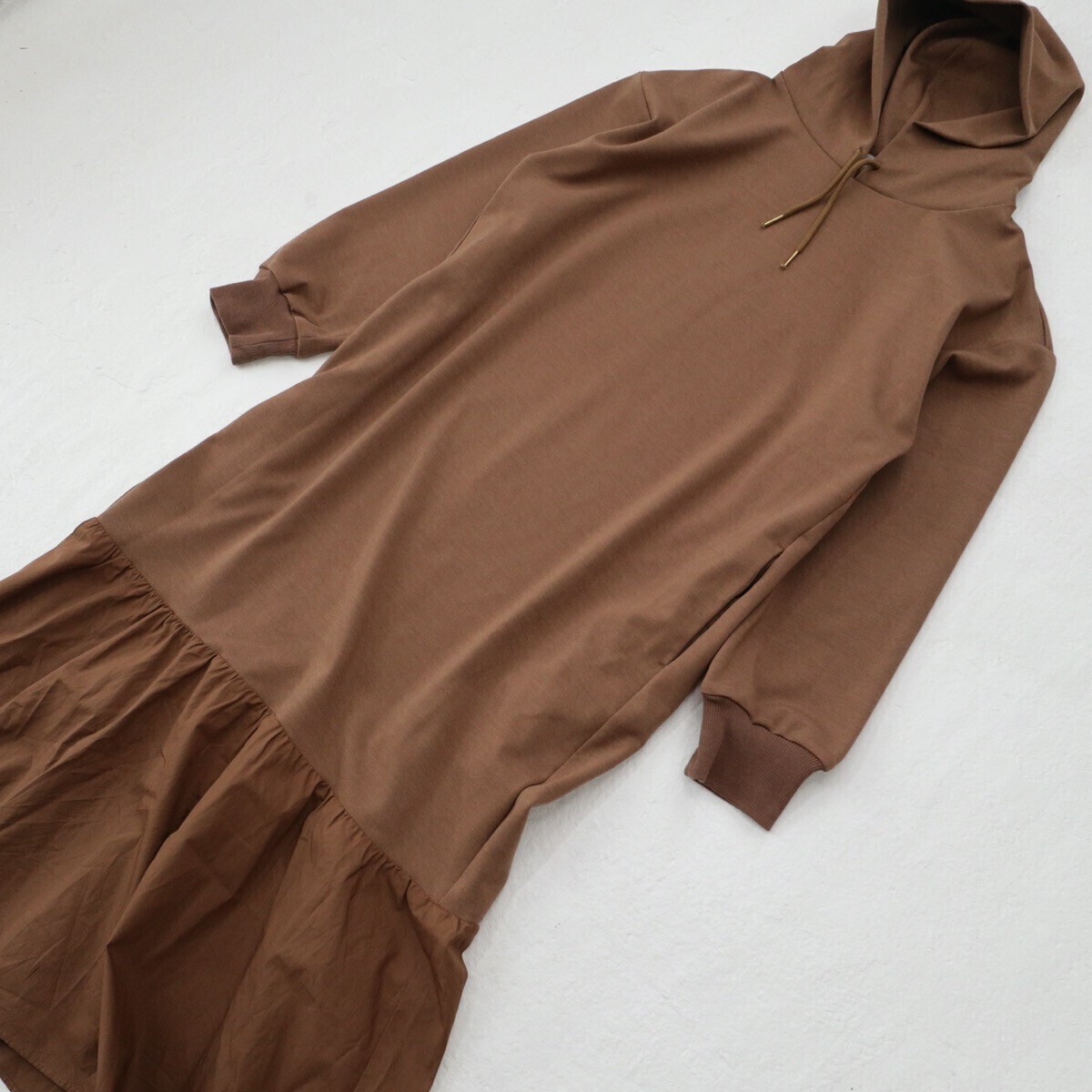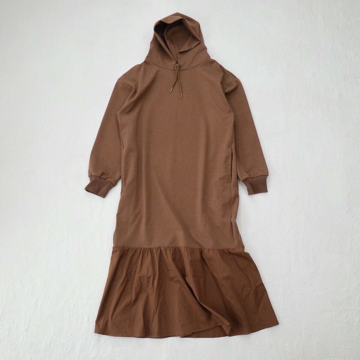 本体はダンボールニット生地を使用し、裾には布帛素材のティアード切り替えを施したワンピースです。