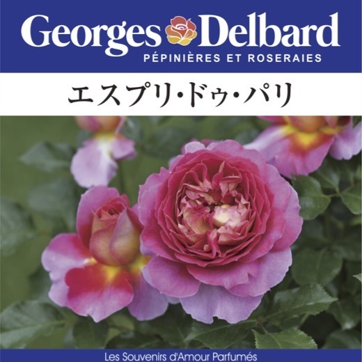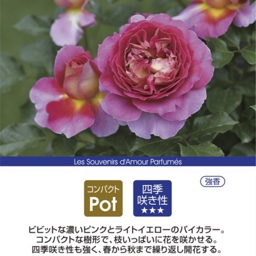ビビットな濃いピンクとライトイエローのバイカラー。フリルがかった花弁が重なる個性的な花形、艶っぽい花色と濃い目の緑の照葉のコントラストで、とても存在感のある株に。コンパクトな樹形で、枝いっぱいに花を咲かせる。四季咲き性も強く、春から秋まで繰り返し開花を楽しませてくれる。フルーツ系の強香。名は、華やかさと艶っぽさが混在する雰囲気がパリのエスプリ(精神・魂)を思わせる。