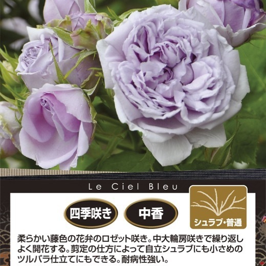 柔らかい藤色の花弁のロゼット咲き、中大輪が房咲きになり、繰り返しよく咲くバラです。中型のシュラブで、剪定の仕方によって自立シュラブにも、小さめのつるバラ仕立てにもできるのが魅力。耐病性が強いので、ビギナーの方にもオススメです。花名は、シャンソンの名曲「愛の賛歌」冒頭のフレーズ「青い空が落ちてこようと、私はあなたを愛し続ける…」の“青い空”の意。