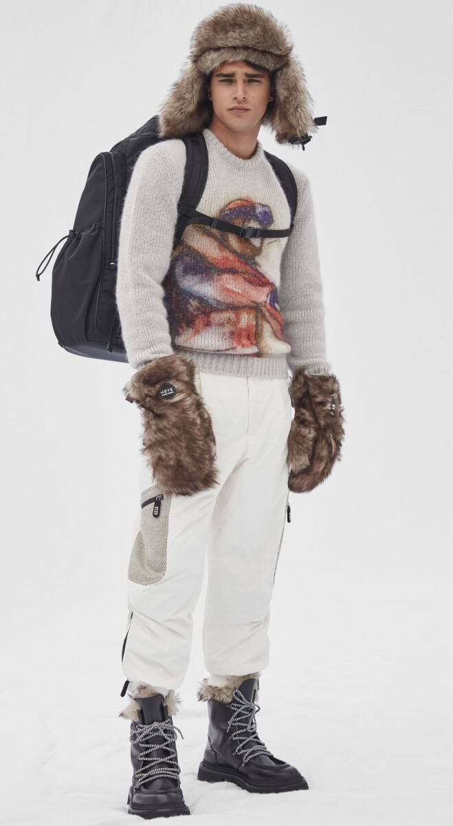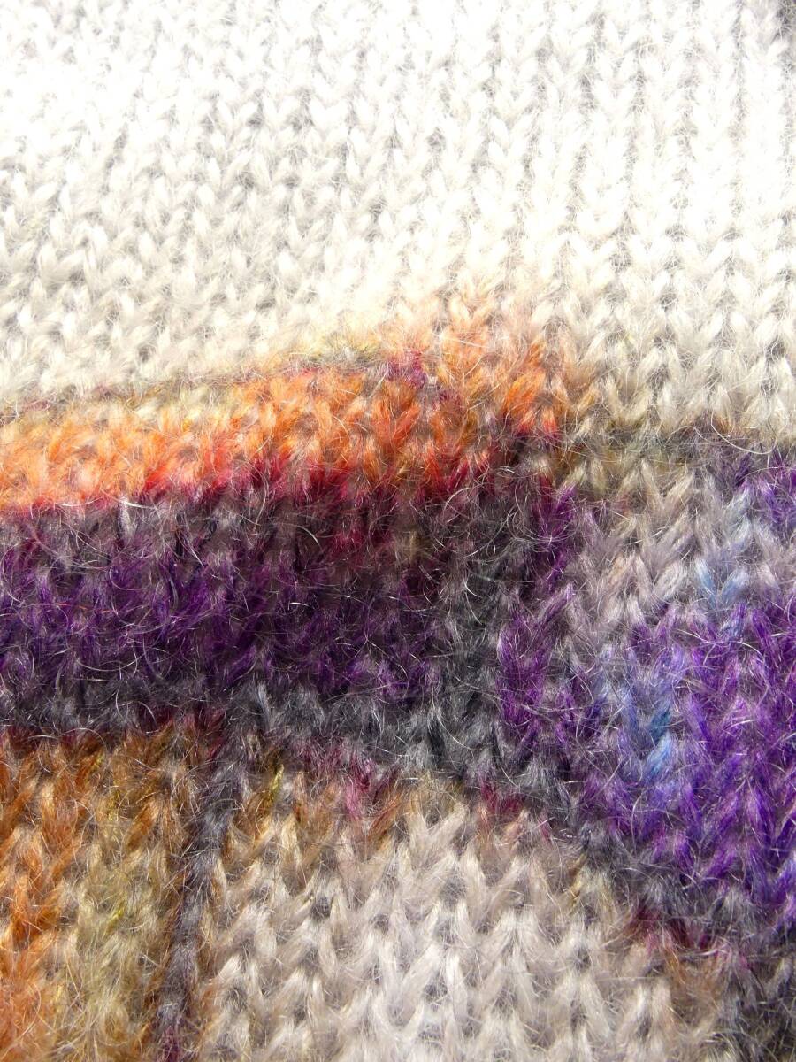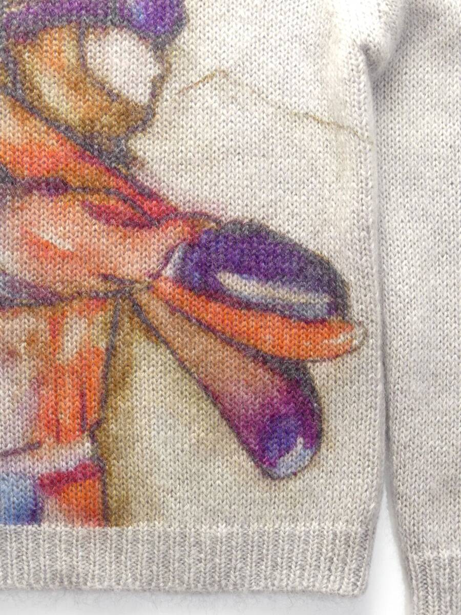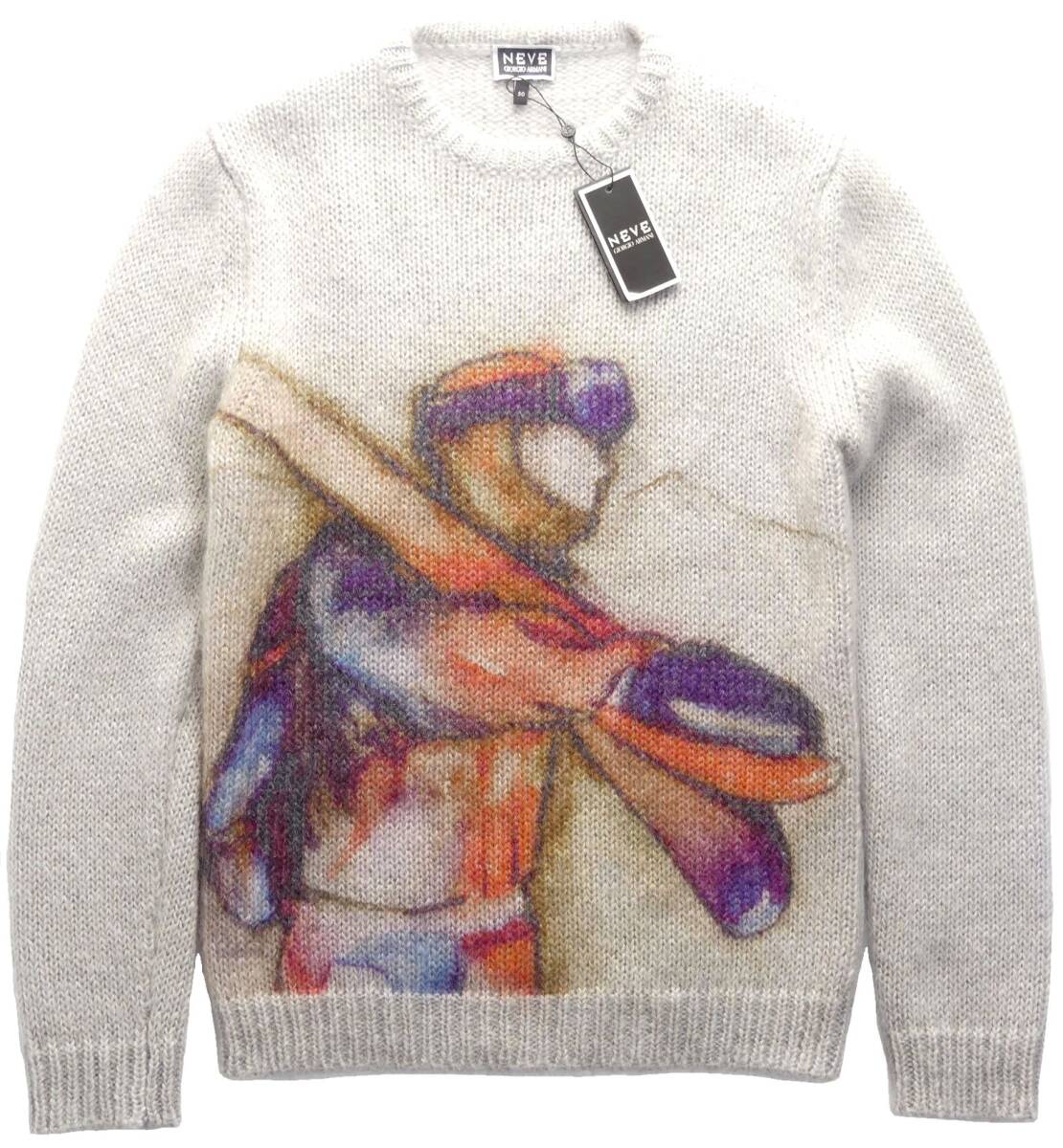 淡色ペイントが施された厚手ニット。ハンドペイントもしくはステンシルペイントのようで個体それぞれ若干の違いがあるユニークピースです。ローゲージ編みの真冬向け厚手タイプ。毛足の長いモヘアウール主体にシルク混紡で滑らかな質感があります。モヘアならではのフワフワ質感をたっぷりの量で体感できる贅沢リッチなセーターになります。モヘアニットは通常のウール羊毛に比べ空気を多く含むため暖かさが違います。「NEVE ネーヴェ」(イタリア語で雪)コレクションは、雪山や高地でウインターホリデーシーズンを楽しむ人のために提案されたジョルジオ・アルマーニのカプセルコレクション。ヨーロッパ各国の高級スキーリゾートでのハイエンドアパレルを、ジョルジオ氏の経験をもとに展開しています。真冬向けの厚手のため着用シーズンは11月下旬ころからでしょうか。ホリデーシーズンをお洒落に、ポカポカに、幸せに過ごせる贅沢品です。