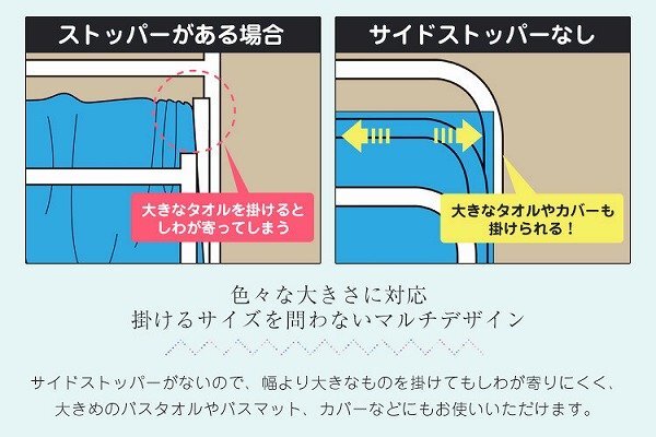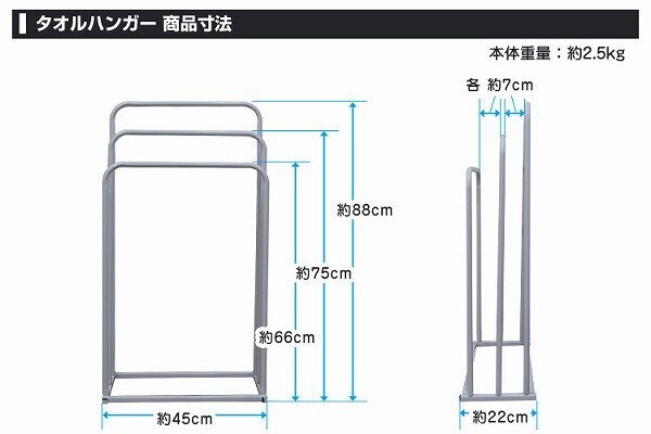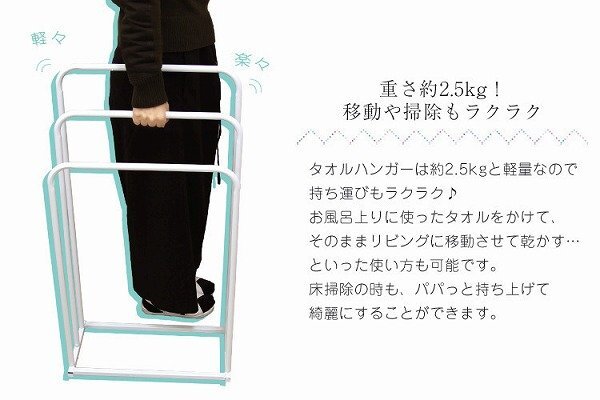 スリムでスタイリッシュなタオルハンガーです。 横からサッと掛けられるので、上から入れるタイプとは違い、 掛ける時にタオルがひっかからず掛ける手間が大幅に短縮できます。 サイドストッパーがないので、大きいタオルやカバーなど掛けられます! 耐久性と清潔感があり、とても軽いので女性でも持ち運びがらくらくです。 洗面所や脱衣場でも邪魔にならない!! サニタリーだけではなく部屋干しにもお使いいただけます。 【商品仕様】 カラー:ホワイト サイズ(約):幅45×奥行22×高さ88cm 重量(約):2.5kg 耐荷重(約):25kg 素材:スチール、塗装 他 【注意事項】 ・お客様組立商品です。 ・本製品は製造の都合上、溶接部分に若干の変色がみられる場合があります。 ・商品は、モニターによって色合いが異なって見える場合があります。 ・仕様・デザインは改良のため予告なく変更することがあります。 |