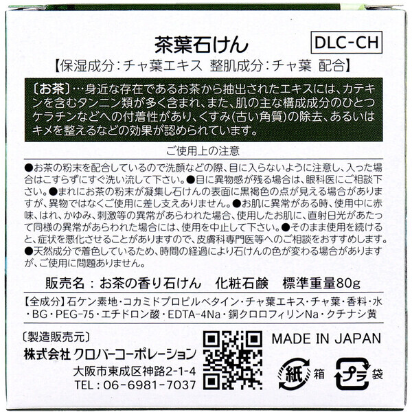 京都産茶葉(整肌成分)配合石鹸。 肌悩みのくすみ(※)を除去してキメの整った明るい肌へ。 (※たまった古い角質や皮脂汚れ、乾燥によるキメの乱れのこと。) ・保湿成分:チャ葉エキス、整肌成分:チャ葉配合。 ・身近な存在であるお茶から抽出されたエキスには、カテキンを含むタンニン類が多く含まれ、また、肌の主な構成成分のひとつケラチンなどへの付着性があり、くすみ(古い角質)の除去、あるいはキメを整えるなどの効果が認められています。 個装サイズ:74X74X34mm 個装重量:約90g 内容量:80g 製造国:日本 【製造販売元:株式会社クロバーコーポレーション】 【全成分】 石ケン素地、コカミドプロピルベタイン、チャ葉エキス、チャ葉、香料、水、BG、PEG-75、エチドロン酸、EDTA-4Na、銅クロロフィリンNa、クチナシ黄 【ご使用上の注意】 ・お茶の粉末を配合しているので洗顔などの際、目に入らないように注意し、入った場合はこすらずにすぐ洗い流して下さい。 ・目に異物感が残る場合は、眼科医にご相談下さい。 ・まれにお茶の粉末が凝集し石けんの表面に黒褐色の点が見える場合がありますが、異物ではなくご使用に差し支えありません。 ・お肌に異常がある時、使用中に赤味、はれ、かゆみ、刺激等の異常があらわれた場合、使用したお肌に、直射日光があたって同様の異常があらわれた場合には、使用を中止して下さい。 ・そのまま使用を続けると、症状を悪化させることがありますので、皮膚科専門医等へのご相談をおすすめします。 ・天然成分で着色しているため、時間の経過により石けんの色が変わる場合がありますが、ご使用に問題ありません。 注意事項 ※予告なく成分・パッケージが変更になることがございます。 予めご了承ください。 *予告なく成分・パッケージが変更になることがございます。予めご了承ください *ダンボールを使用して発送する場合には、入数以下の個数の場合、 中古ダンボールを使用する場合があり、ご注文の商品とは異なるダンボールになる場合があります。 あらかじめ、ご了承ください。 |