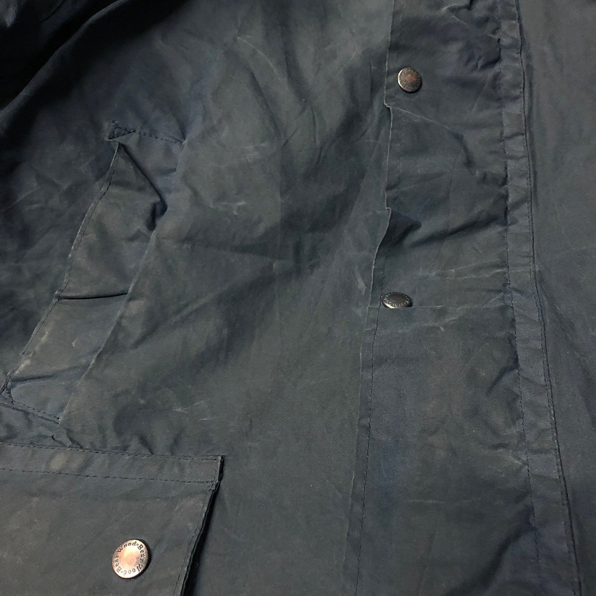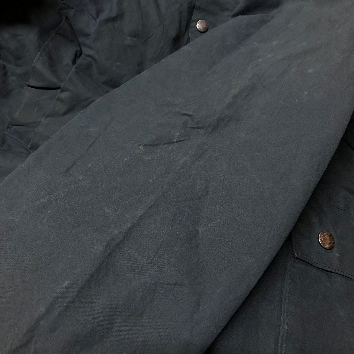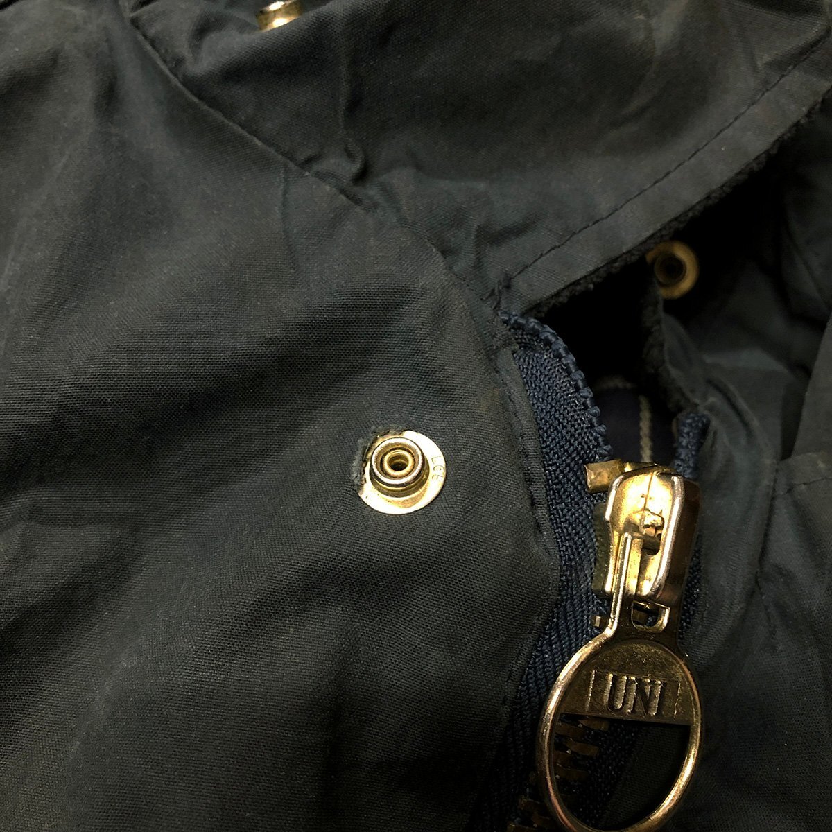 中古品です。使用感があります。全体的にオイル特有の擦れや汚れや匂い、フロント第一スナップボタン部分に破れ、付属の襟パーツとライナーがありません。