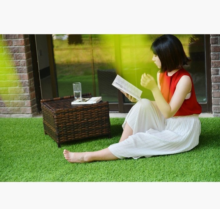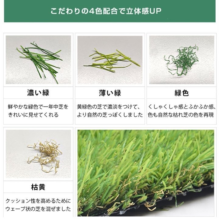 ◆ 01SGS認定 品質管理で、安全性を確認できます。 ◆ 02UV加工 紫外線に当たることで、時間の経過に伴い、色落ちは進んでいきます。 ただし、当店の人工芝は葉にUV加工で劣化のスピードが遅く、短期間で急激に色落ちすることはありません。 ◆ 03C字パイル加工 近年、小さいC字型は特に流行っています。直立性悪い芯付けの糸より、C字パイル加工でへたりにくく、復元性が優れます。 ◆ 04高耐久の3層基布 シングルPPより、3層基布で耐久性がよく、引っ張っても抜けにくい。 ◆ 05草丈が20mmと長い 草丈が20mmと長いので、ふかふかとした踏み心地! 柔らかくて葉の密度も十分なので裸足で踏むと気持ち良いです! 一般の人工芝より一本一本の葉が細いので、リアルな上に裸足で歩いても気持ち良いです。 ◆ 06こだわりの4色配合で立体感UP 高密度に植えられた2色のストレートの芝生に、カールした2色の枯草を混ぜることで、より本物に近い風合いを表現しています。 芝をよく見てみると、枯れた風合いの芝も含まれていてかなり本物に近い質感です。 1.ストレートパイル:濃い緑 鮮やかな緑色で一年中芝をきれいに見せてくれます。 2.ストレートパイル:薄い緑 黄緑色の芝で濃淡をつけて、より自然の芝っぽくしました。 ◆ 07水はけを良くする「透水穴」付き 底面に穴が均一に空いており、水が流れ出やすくなっており、雨の後でも乾きやすいです。 さらに水はけの良い短毛タイプや底面がプラスチックの格子状になったタイルタイプもあります。 人工芝敷設後、ビニールプールの水をひっくり返して捨てたのですが、水がたまることなくすぐにしみ込んでいき、水はけの良さにびっくりしました。 ◆ 08カンタンに設置 1・敷きたい場所を決めて、雑草や石をどけて地面を踏み固め、平にしていきます。 2・ならした土の上に人工芝を広げて敷いて、芝が浮き上がらないように、U字ピンで固定していきます。(土の上に設置の際は防草シートを張りその上に設置することをオススメします。)(土の上に人工芝を設置すり際は、人工芝につなぎ目から雑草が生えてくることがあります。あらかじめ防草シートなどをご利用するころをお勧めします。) 3・継ぎ目は両方の芝にかかるように、U字ピンでを打ち込みます。(ピンはゴムハンマーで叩くとすんなり入っていきます。入っていかない時は下に石があるようなので、少しずらして打ち直します。) 4.余った部分はハサミで切っていきます。(シートの裏側にある水はけ用の穴に沿って切っていけばまっすぐ切れます。) 5・最後に芝目をブラッシングして、完成です。