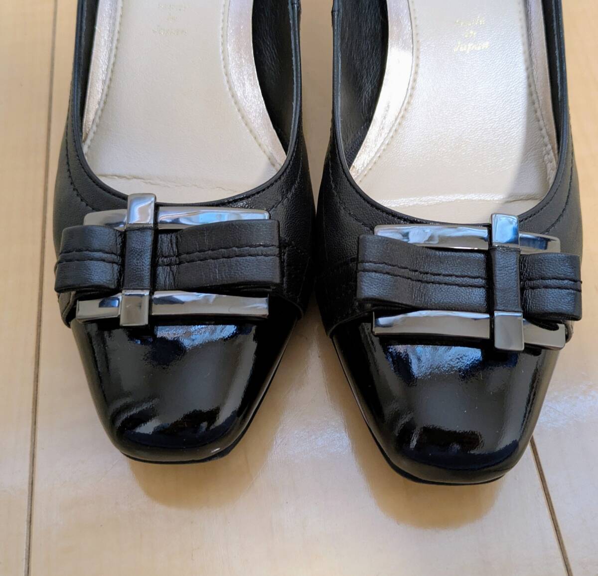 メタルバックルとリボンのデザインが可愛い一足です。トゥ部分はパテント素材です。アッパーとリボン部分は牛革です。