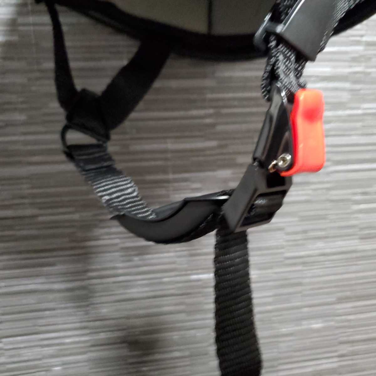 あご紐は長さ調整可能なタイプでワンタッチバックル式になります。差し込むだけで装着可能で