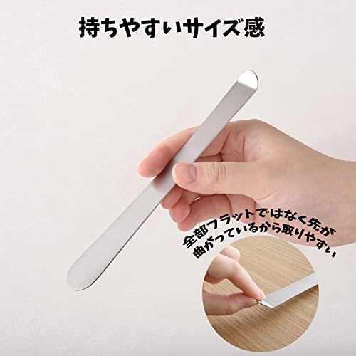 ・【瓶づめのご飯のお供もすくいやすい】ヘラの反対側は先端が少し曲がっていて、ビンの隅にもほどよくフィットし、食材がすくいやすいです。また、ヘラを平らな所に置いても、先端部分が曲がっているので掴みやすく便利です。
