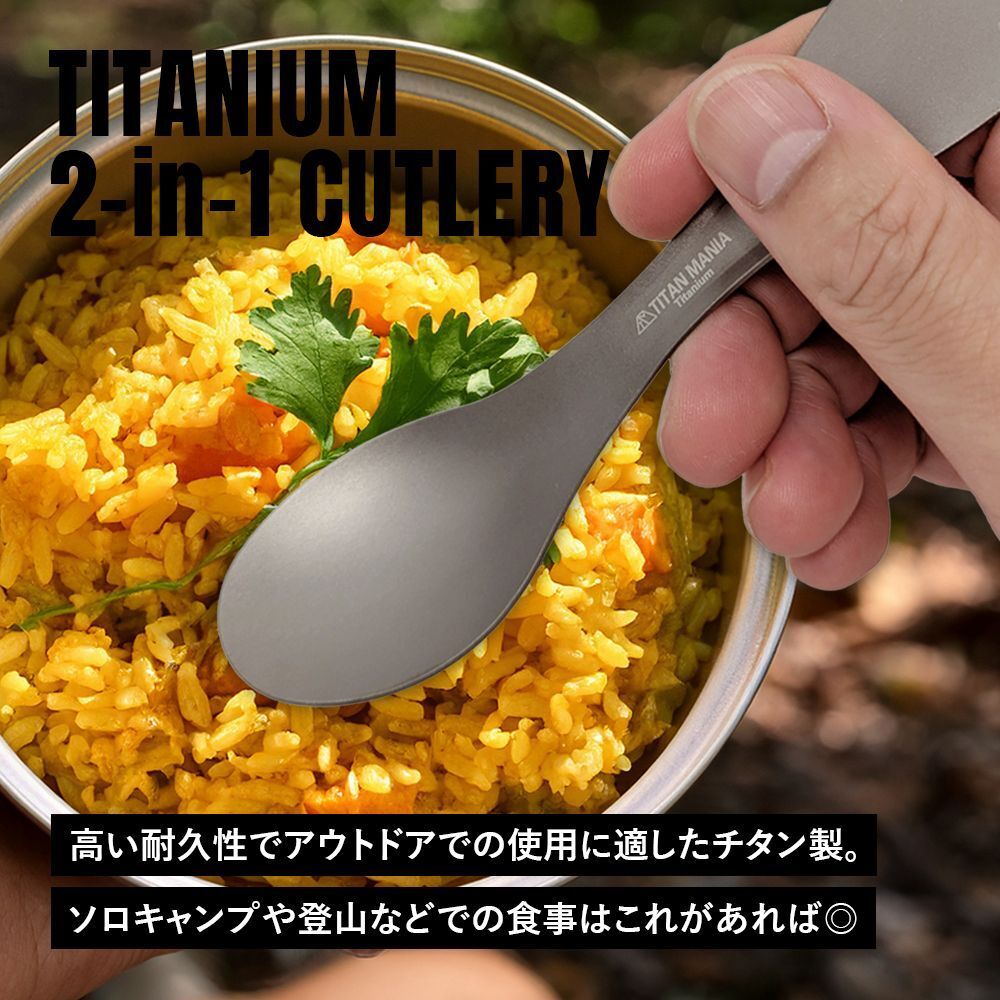超軽量で頑丈、サビにも強い、スプーンとフォークの一体型のチタン製2in1カトラリー。これひとつあれば、登山やソロキャンプなどで大活躍。 高い耐久性でアウトドアでの使用に適したカトラリー。携帯性の高いチタンギアは装備を軽量化できるので登山やソロキャンプなどウルトラライト(UL)キャンプにおすすめ。