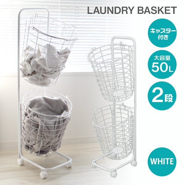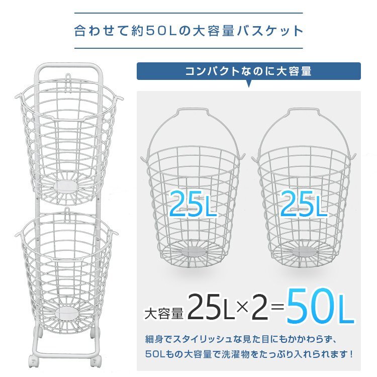 通常のバスケットを分別用に2つ並べて置くと幅を取り、上部にデッドスペースが生まれてしまいます。 こちらの商品は幅約35cmに2つのバスケットを縦に並べることが可能。 デッドスペースを活用することで物が多くなりがちな洗濯機まわりも無駄なくすっきり。 狭くなりがちなスペースを有効に活用することができます。 2つのバスケットは取り外しも可能で、持ち手があるのでベランダに運ぶ時なども便利にお使いいただけます。 キャスター付きで、ラックごとの移動もスムーズです。 ランドリー以外にキッチンの食品ストッカー、リビングの雑貨入れ、おもちゃ収納も使えます! 【商品仕様】 カラー:ホワイト サイズ:(約)幅35×奥行き40×高さ107cm バスケット内寸:(約)直径28(底部)×高さ37cm 重量:(約)3kg 容量:(約)50L(上段25L、下段25L) バスケット耐荷重:(約)10kg 素材:スチール、ナイロン |