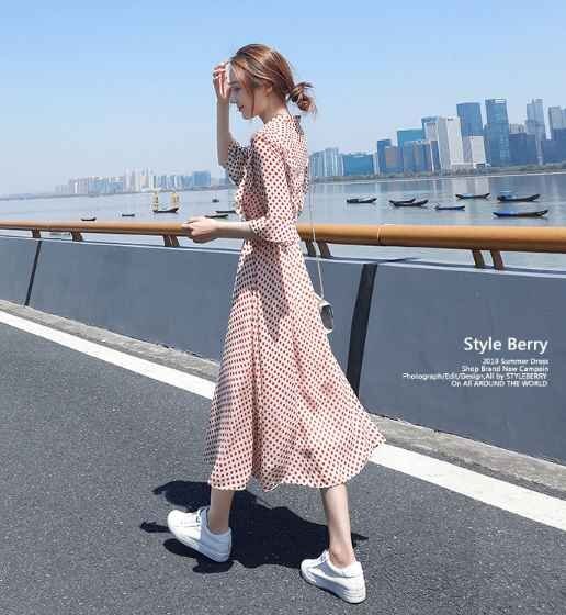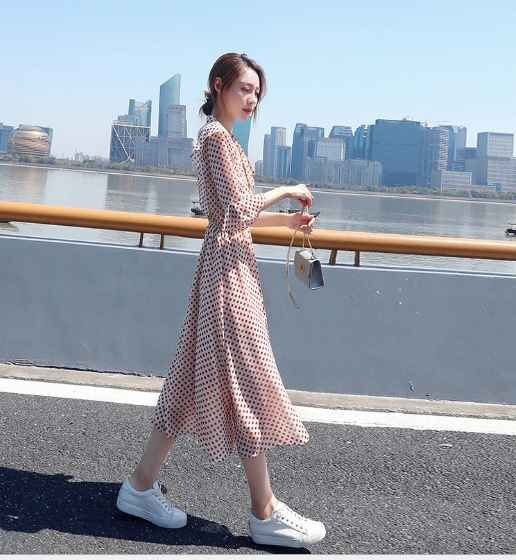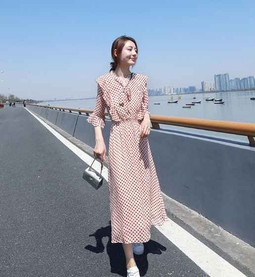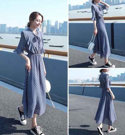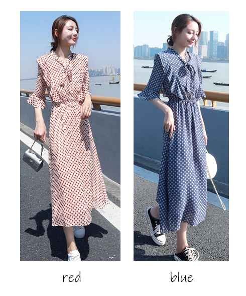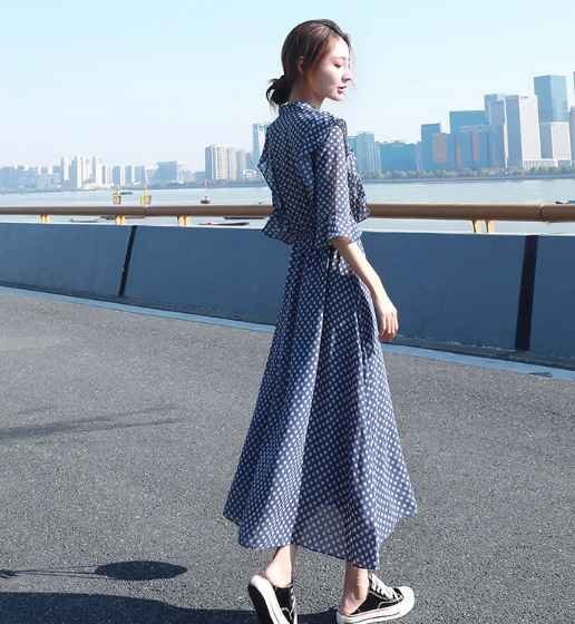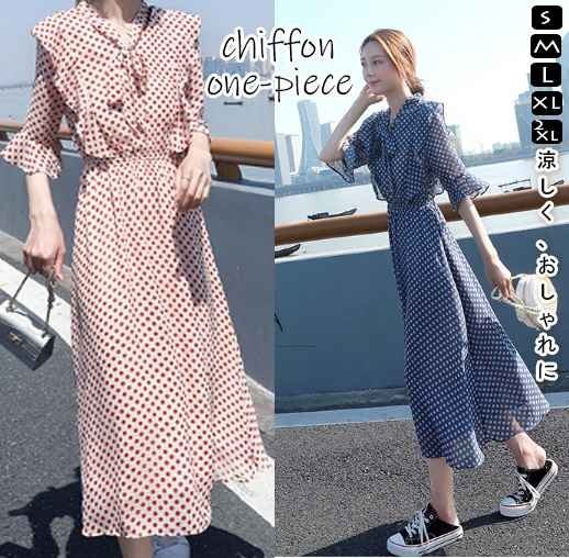 ロング丈、すとんとハイウエストAライン、フリルがフェミニンな女性らしさを引き立たせるシフォンワンピース。袖にもフリルが付き、着やせ効果があり、おしゃれです。