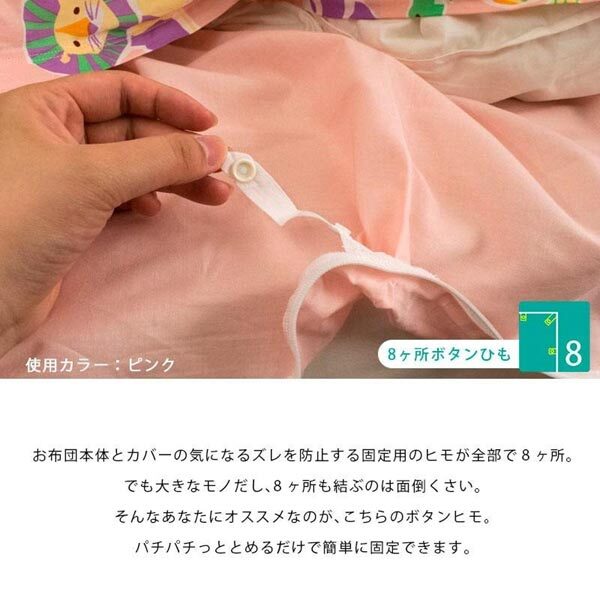 | 内 容 | ■ウエスティ サファリ 掛布団カバー ジュニアサイズ(613160) ■135×185cm ■組成:綿100% ■カラー:ピンク ■仕様:全開ファスナー、8か所ホックテープ付 ■日本製 キュートなアニマルがいっぱい♪可愛いけどコドモ過ぎない、お洒落なふとんカバー。 パンダやゾウやキリン、子どもたちに大人気のキャラクターたちが描かれたアニマルパターン。 淡い色合いでコドモ過ぎないから使いやすい♪ 天然素材のコットン(綿)100%生地なのでお肌にやさしく、 敏感肌の方にも安心の仕上がりに。 お布団を出し入れしやすい全開ファスナー採用。 さらにカバー内側には布団を固定するためのスナップボタン紐が8ヶ所に付いています。 紐を結ぶ必要がなく、パチパチっとワンタッチで留められるのでお手入れもラクラク。 もちろん、ご家庭の洗濯機で丸洗いもOK! ※パッケージのラベルが異なる場合があります |