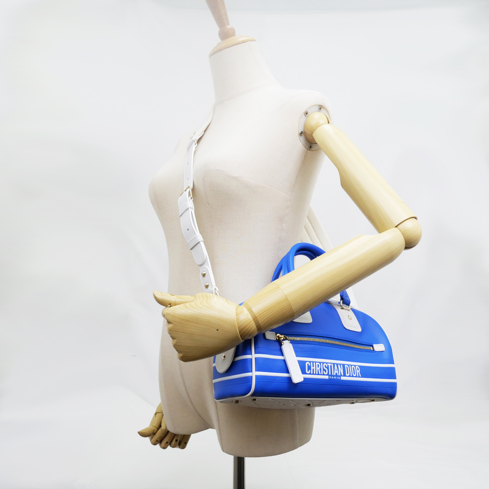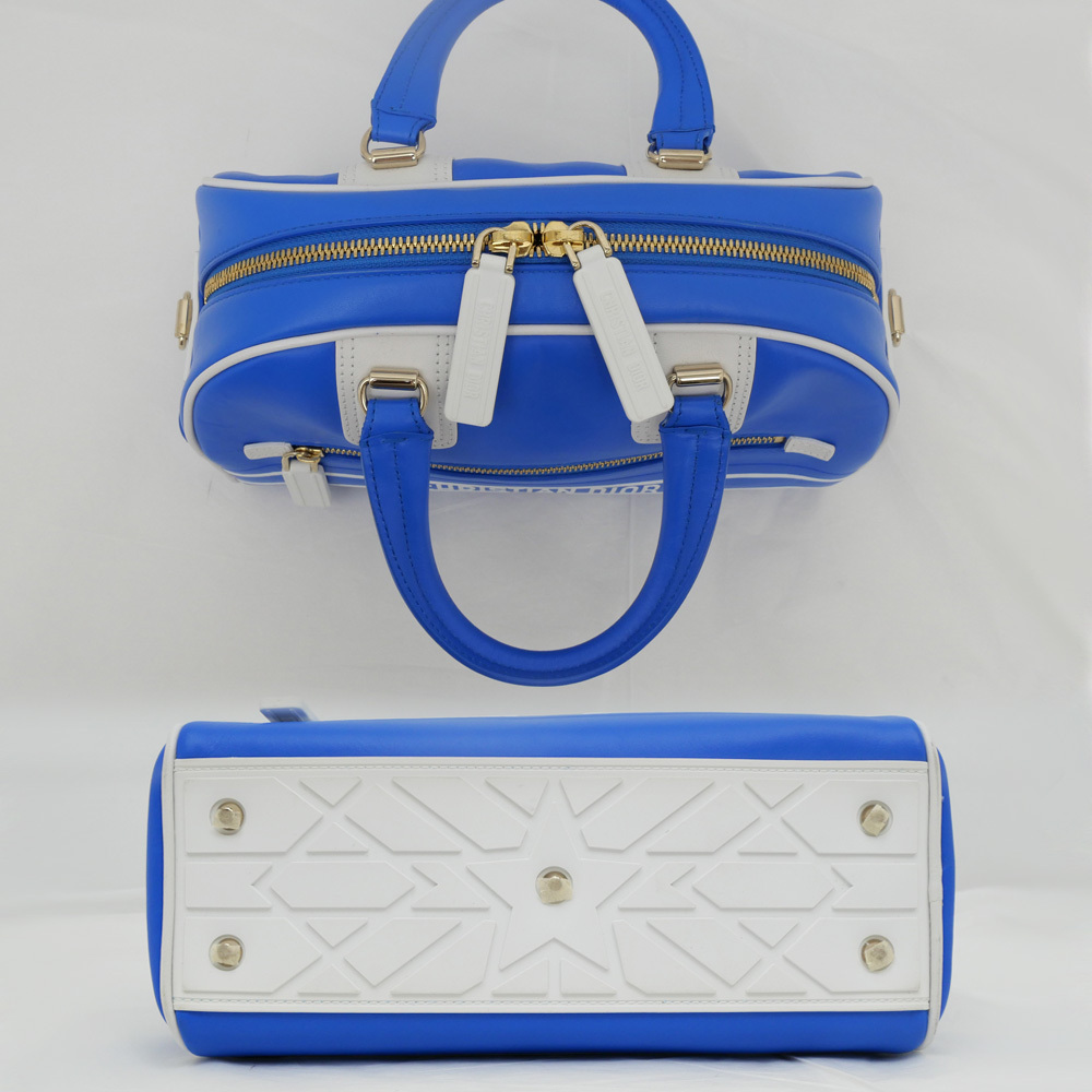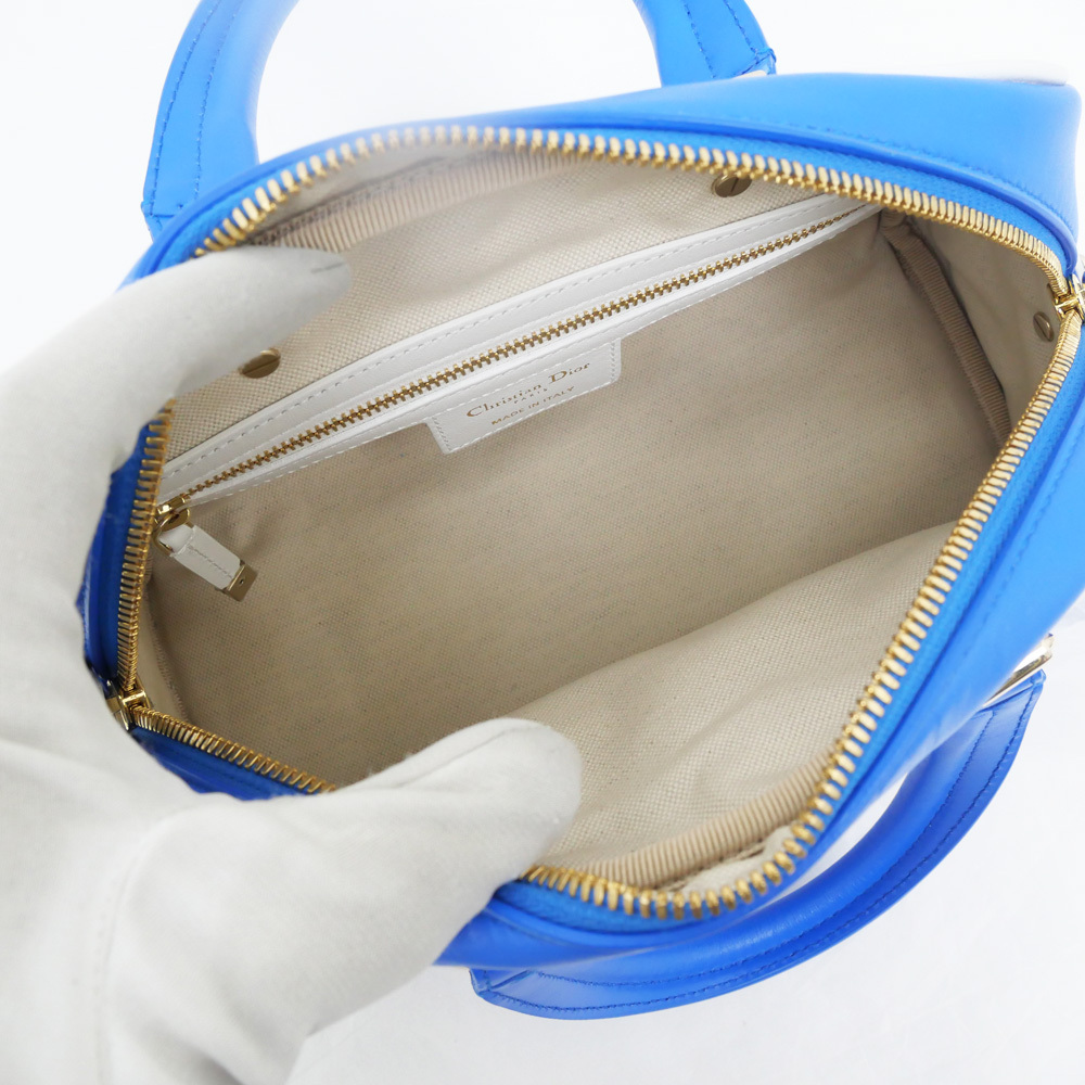 【名東】ディオール VIBE スモール ボウリングバッグ ハンド ブルーXホワイト トート ショルダー カーフスキン レディース