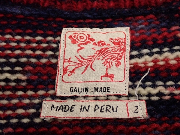 | GAIJIN MADE ガイジンメイドのニットカーディガンです。ペルー製、とても雰囲気のあるデザインですね。素敵にお使い頂けると思います。気になる方は是非ご検討下さい。 | |