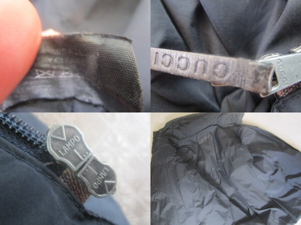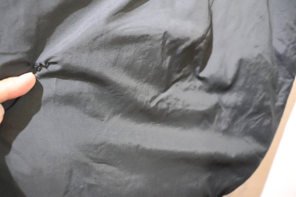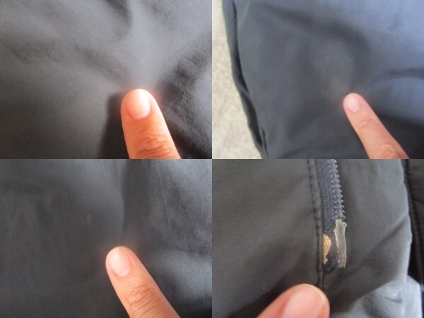 ・背面左裾上に手縫いの補修跡、開閉は出来ますがジップ付け根に若干の裂け、ボディに薄いシミの付着はありますが、目立ったシミや破れ等はありません。