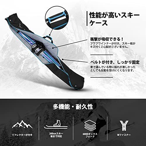 【200cmスキー板まで対応できる!】スキーケースのサイズは縦200cm×横38.5cm×深さ37.5cmで、重量が1.1kgです。さまざまなスキー板にも対応できます。最大200cmのスキー板まで対応でき、友達と一緒にスキーに行く際には便利になっています。(スキー板1組が入る、1台用のスキーケース)