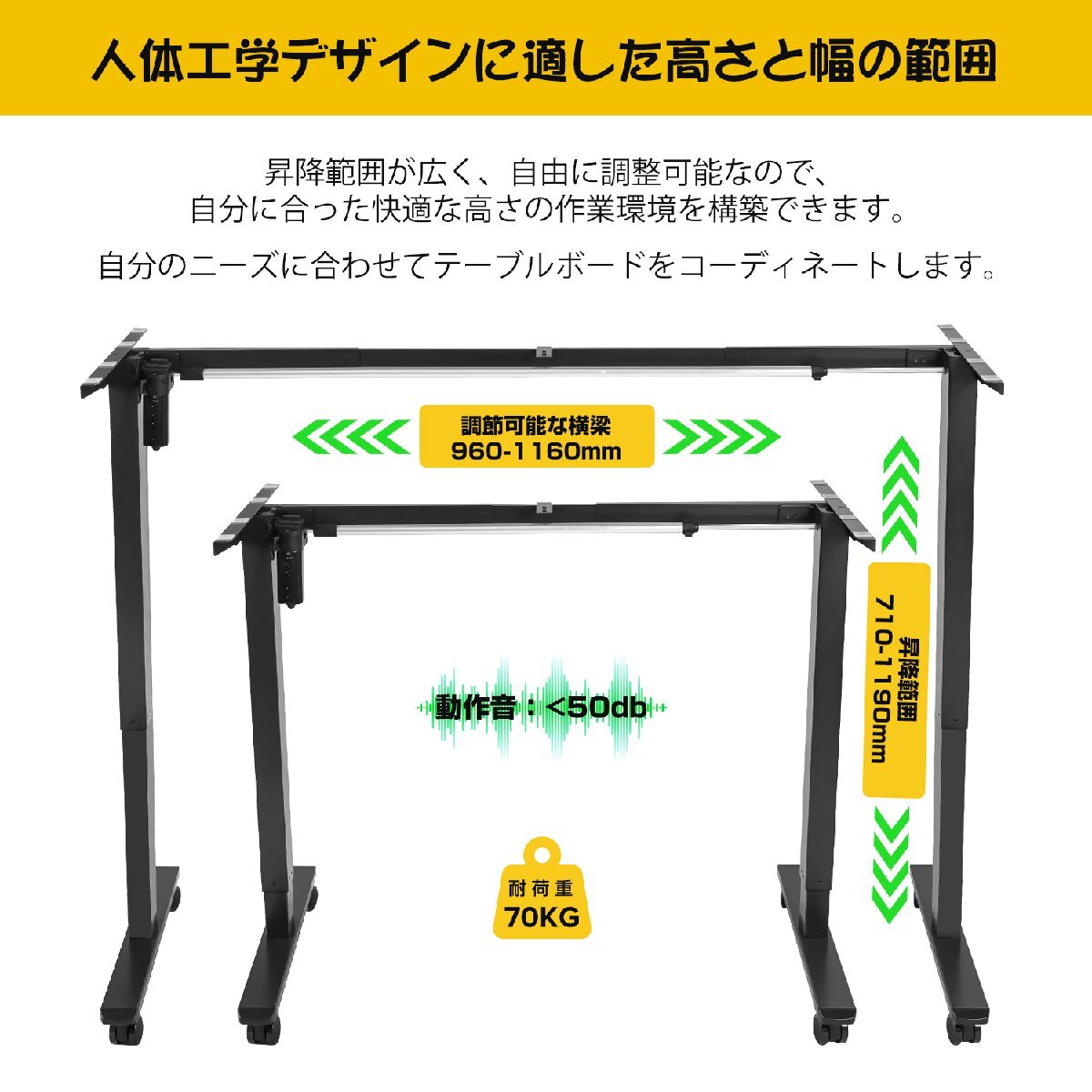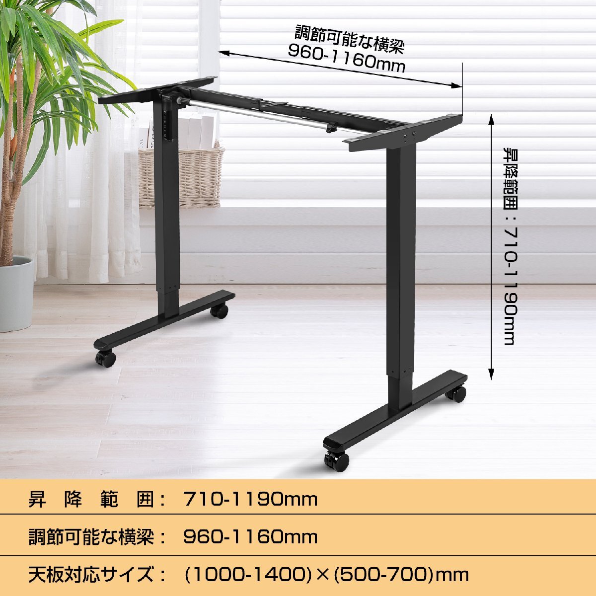 • 1. 【基本情報】昇降範囲:720-1200mm;調節可能な横梁:960-1160mm;天板対応サイズ:(1000-1400)*(500-700)。この製品には天板が付属しておらず、必要な天板のサイズを自由に選択できます。昇降音は50デシベル未満で、静かな昇降音のため、夜間でも使いやすいです。負荷耐久力は最大70kgで、二段式の脚立構造を採用し、安定して丈夫です。