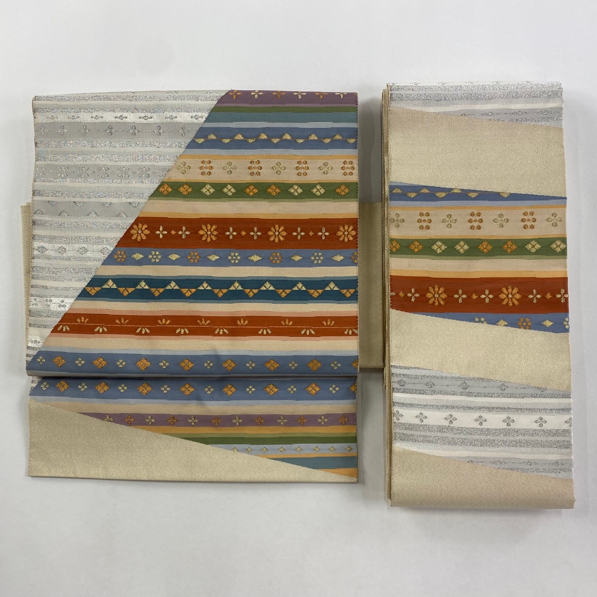 | 付け帯 秀品 作り帯 花 縞模様 金銀糸 ベージュ 正絹 【中古】 |