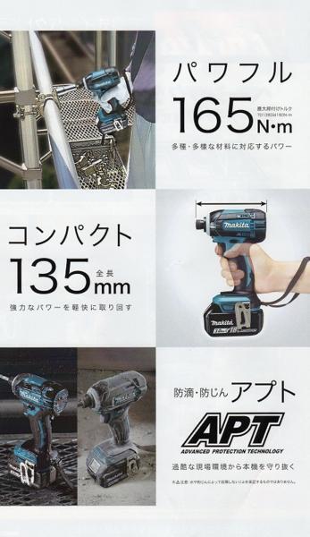 ■ マキタ 18V インパクトドライバー TD149DZ 青 ★本体のみ ■ 新品! ●APT 防滴・防じん「アプト」インパクト!! ●防塵防滴アプト仕様 ●小型化の基本性能に加えて、タフ性能も向上! ●コンパクト 全長135mm 強力なパワーを軽快に取り回す ●165Nm 多種・多様な材料に対応するパワー! ●2灯式LEDライト付き 蓄光バンパ付き 【仕様】 ・最大締め付けトルク165N・m ・締め付け能力(mm):小ネジM4-M8/ボルトM5-M14/コーススレッド22-125/高力ボルトM5-M12 ・回転数:0-2300回転/分 ・打撃数:0-3200回/分 ・全長135mm ・質量1.5kg(バッテリ含む) ★バッテリー、充電器は付属いたしません。 ★使用可能バッテリー:マキタ18V BL1830、BL1840、BL1850B、BL1860B など ★人気商品です! ※是非!この機会にお買い求め下さい! |