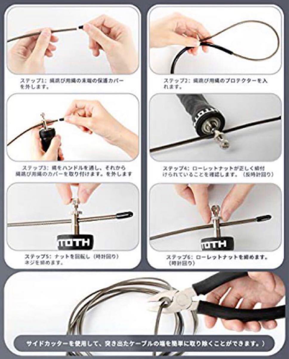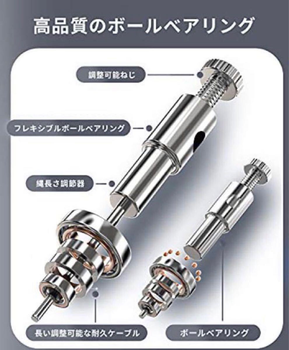 【360°のボールベアリング】縄跳び用縄は良質のボールベアリングを採用しており、この縄を安定させ、素早く回転させます。縄はフレキシブルワイヤで作られていますので、もつれたり、ねじれたりする心配はありません。ボールベアリングはまた、縄跳び用縄が持続的に使用されている間、損傷を受けないように保護することができます。