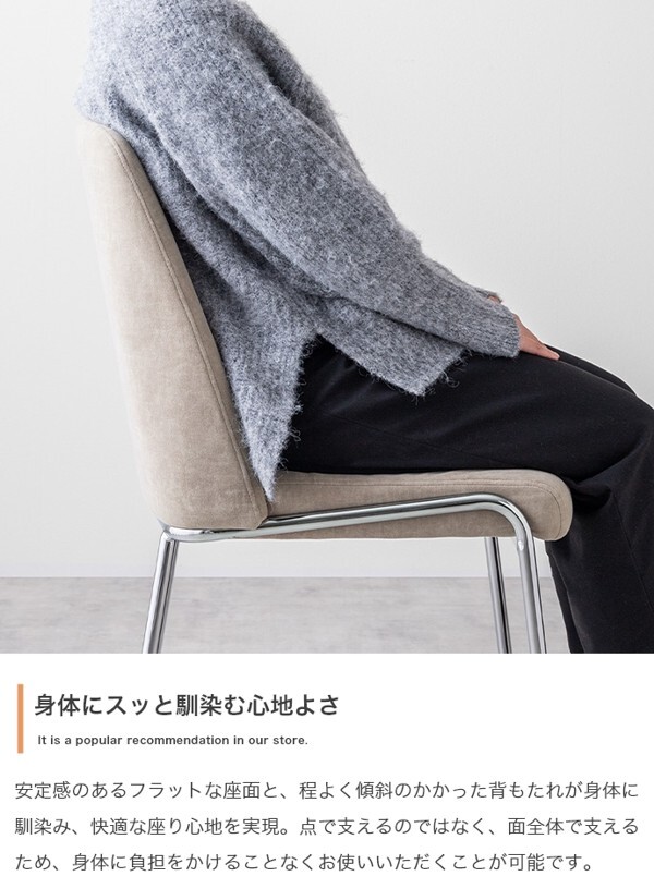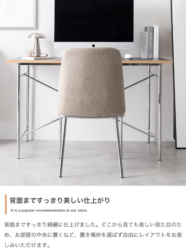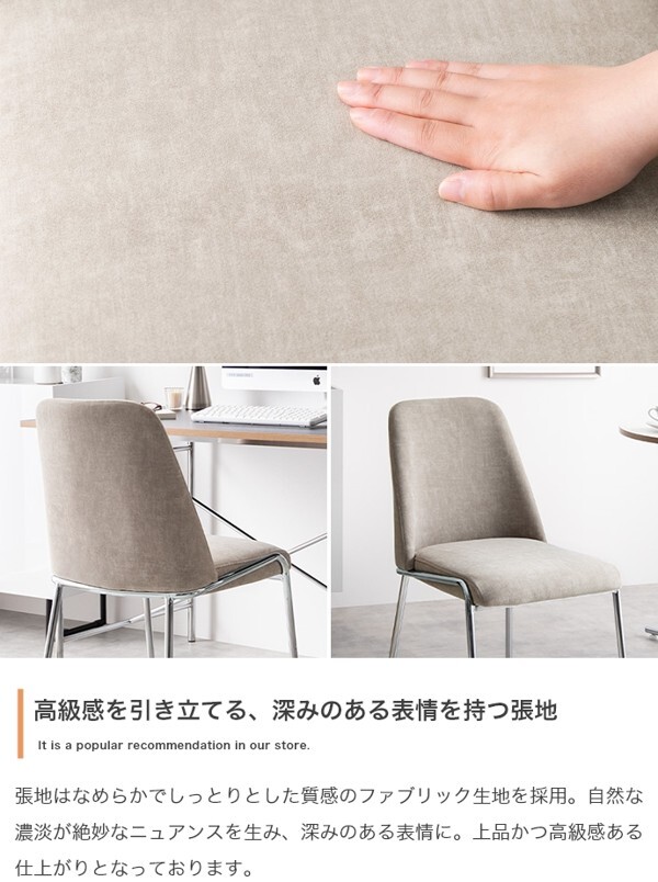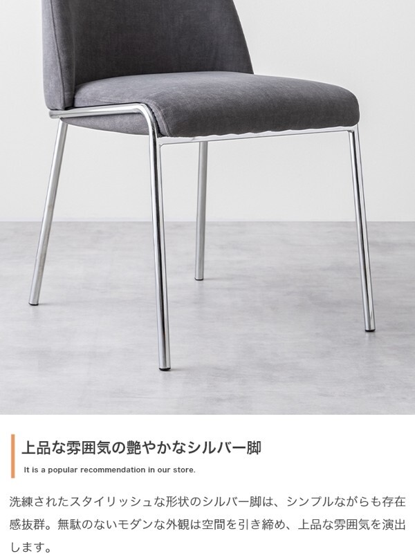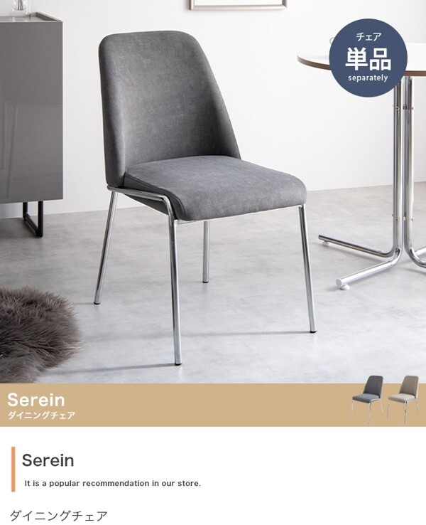 ※現在ご覧の商品ページはベージュのご購入ページとなります。 ヤフオクの仕様上単一ページに複数バリエーションを掲載することができませんので、他バリエーションが希望の場合は別ページでご購入お願い致します。 しっとりとした上質なファブリック生地×シルバー脚が洗練された雰囲気を与える『Serein(セラン)』ダイニングチェア。 張地はなめらかでしっとりとした質感のファブリック生地を採用。 自然な濃淡が絶妙なニュアンスを生み、深みのある表情に。 上品かつ高級感ある仕上がりとなっております。 また座面と背もたれには、弾力性のあるウレタンを使用し見た目だけでなく、座り心地にもこだわりました。 長時間座っていても疲れにくいため、ダイニングやデスクなど様々なシーンで活躍します。 配達業者を指定いただくことはできません。 沖縄・離島に関しましては、別途配送料が必要となります。 北海道への配送も別途配送料が必要になる場合がございます。 ※別途送料が発生する場合は後ほどご連絡させていただきます。 タイミングによっては在庫切れの場合があります。