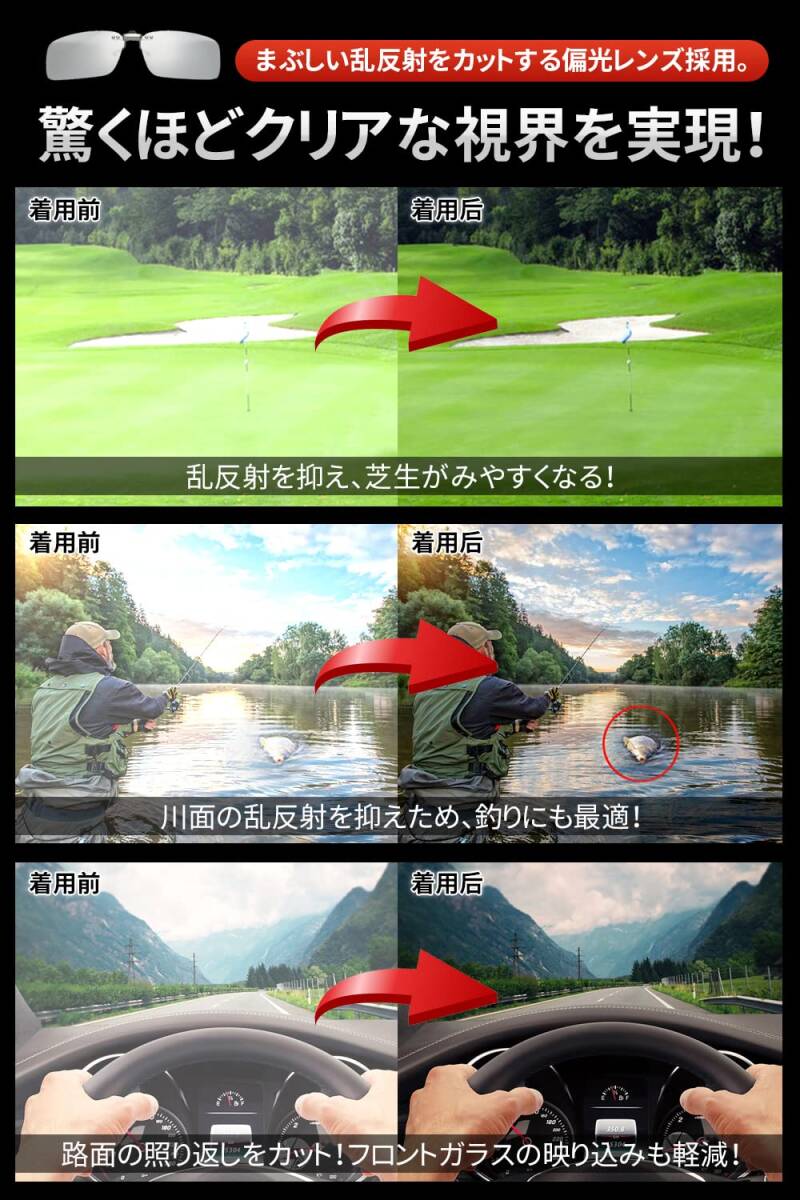 2.【偏光レンズ&よりクリアな視界】クリップオンサングラスの偏光レンズで乱反射光を抑え、芝目が読みやすくなります。また、有害な紫外線をカットして目を守ります。車の運転でも路面やフロントガラスの反射を消し、クリアな視界を確保できます。