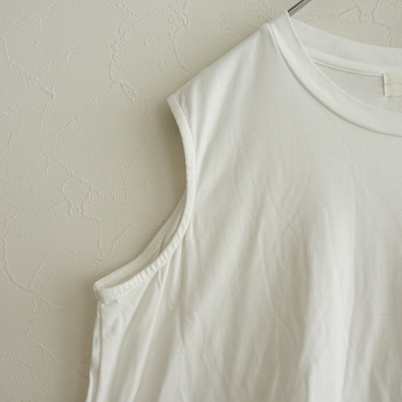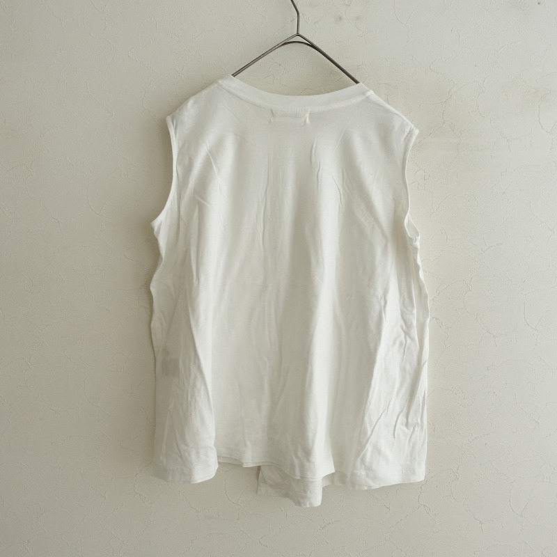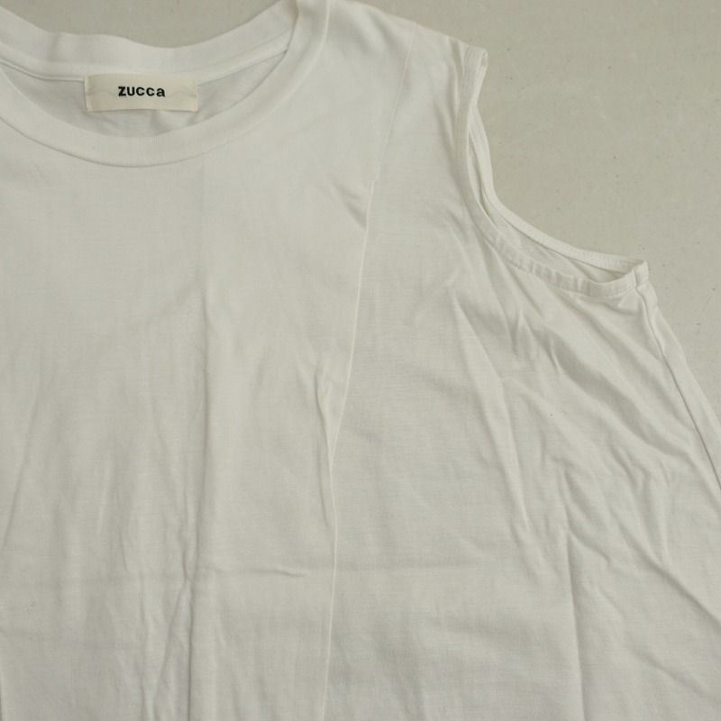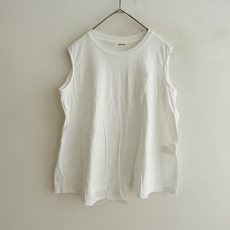 | ZUCCAのノースリーブデザインカットソーです。カラーはホワイトです。フロントは二枚仕立てで、被せのあるデザインです。 |