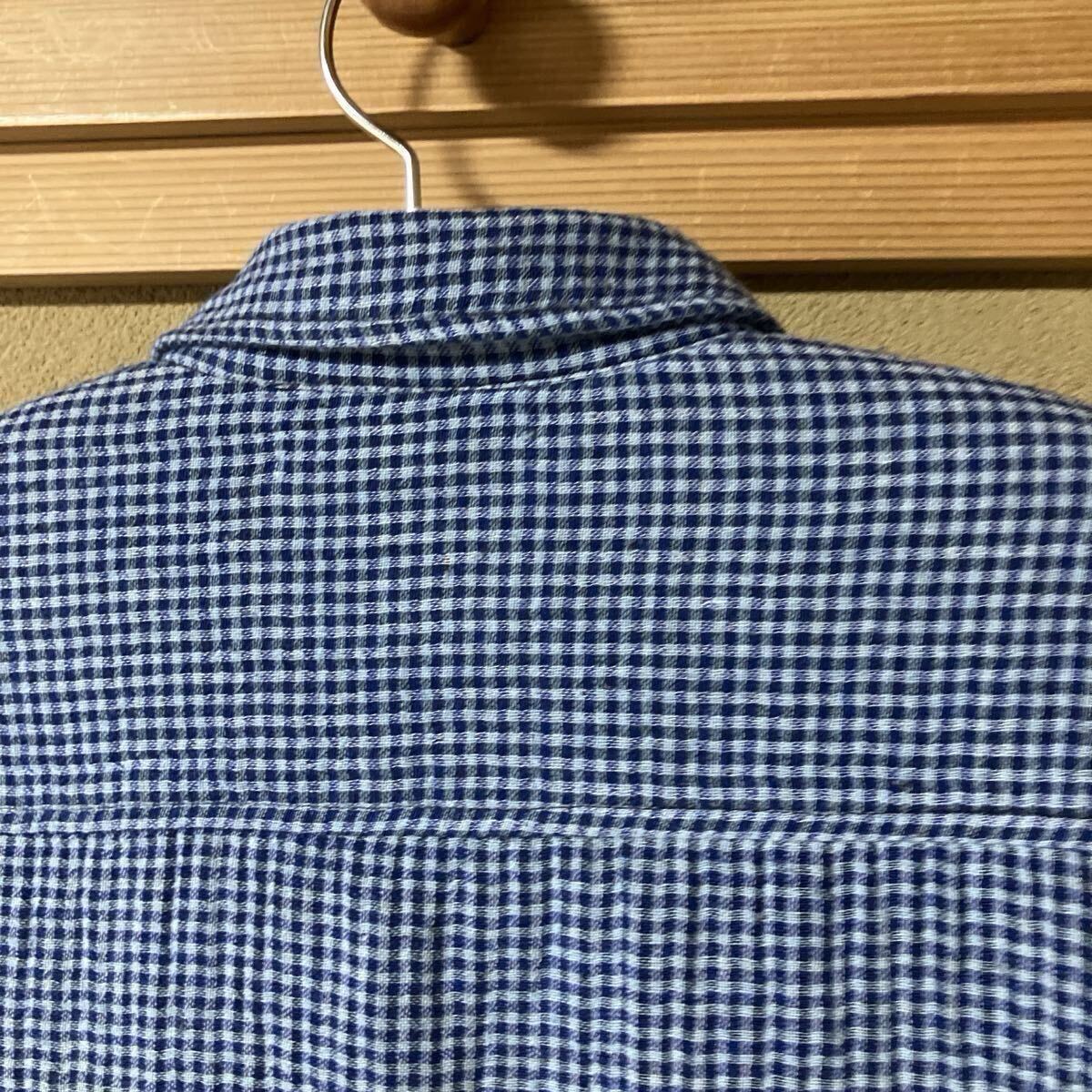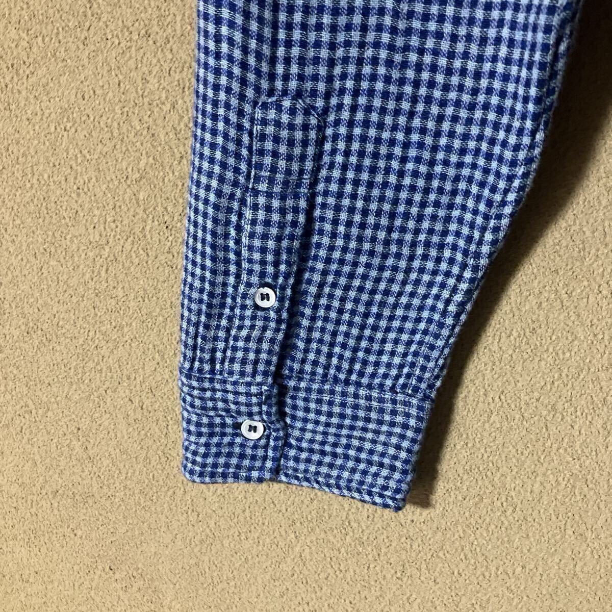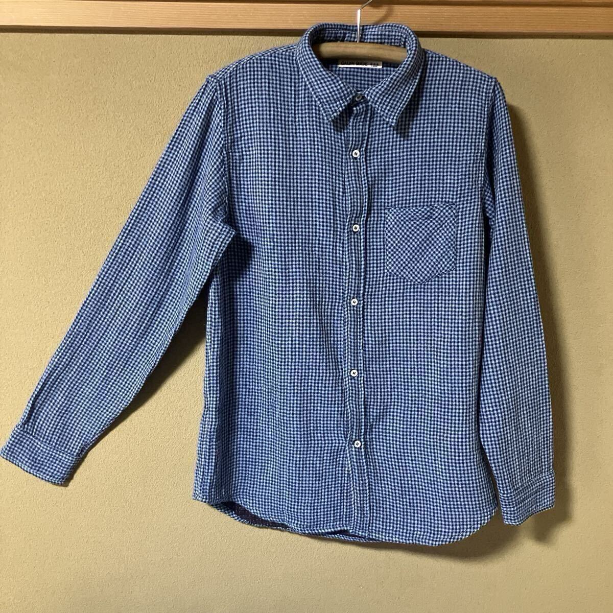 ダブルフェイスの生地で表はネイビーxホワイトスモールチェック柄、裏はブラウンで細かい刺し子ステッチが入った長袖シャツ。肌触りの柔らかいユーズドの雰囲気がたっぷりのシャツです。ユーズド好きなかたにはお薦めです。コチラはサイズがMになります。