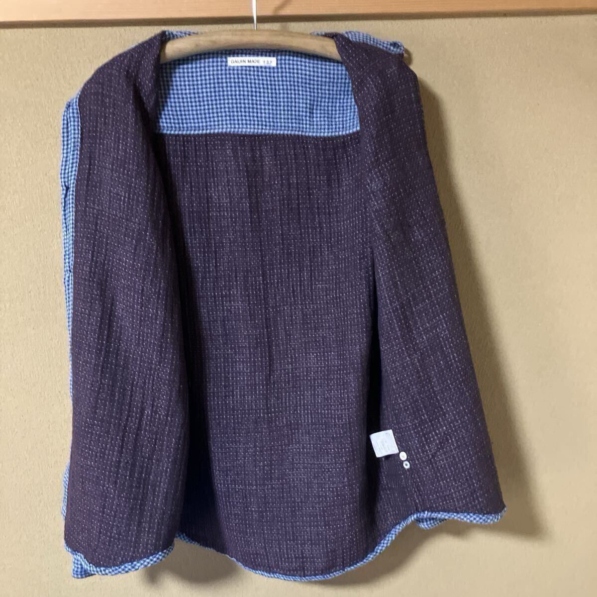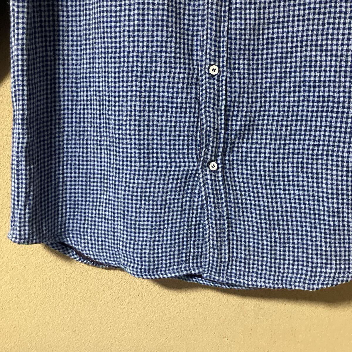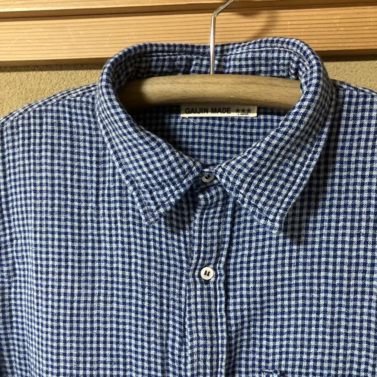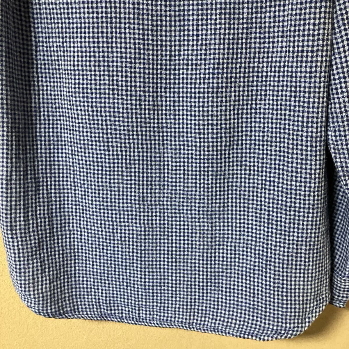 ダブルフェイスの生地で表はネイビーxホワイトスモールチェック柄、裏はブラウンで細かい刺し子ステッチが入った長袖シャツ。肌触りの柔らかいユーズドの雰囲気がたっぷりのシャツです。ユーズド好きなかたにはお薦めです。コチラはサイズがMになります。